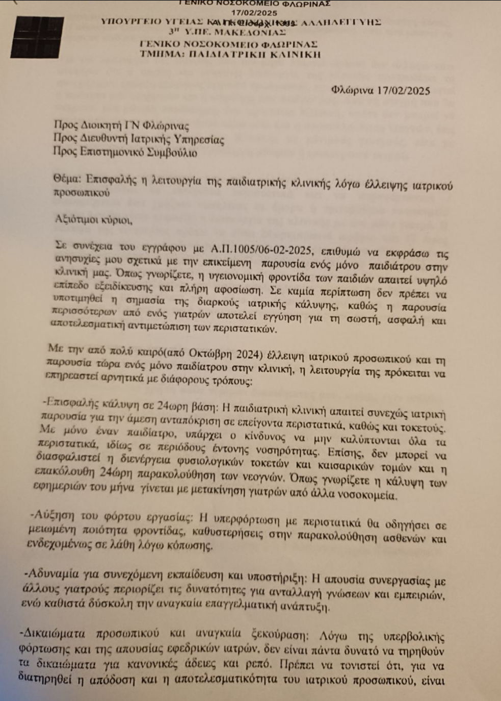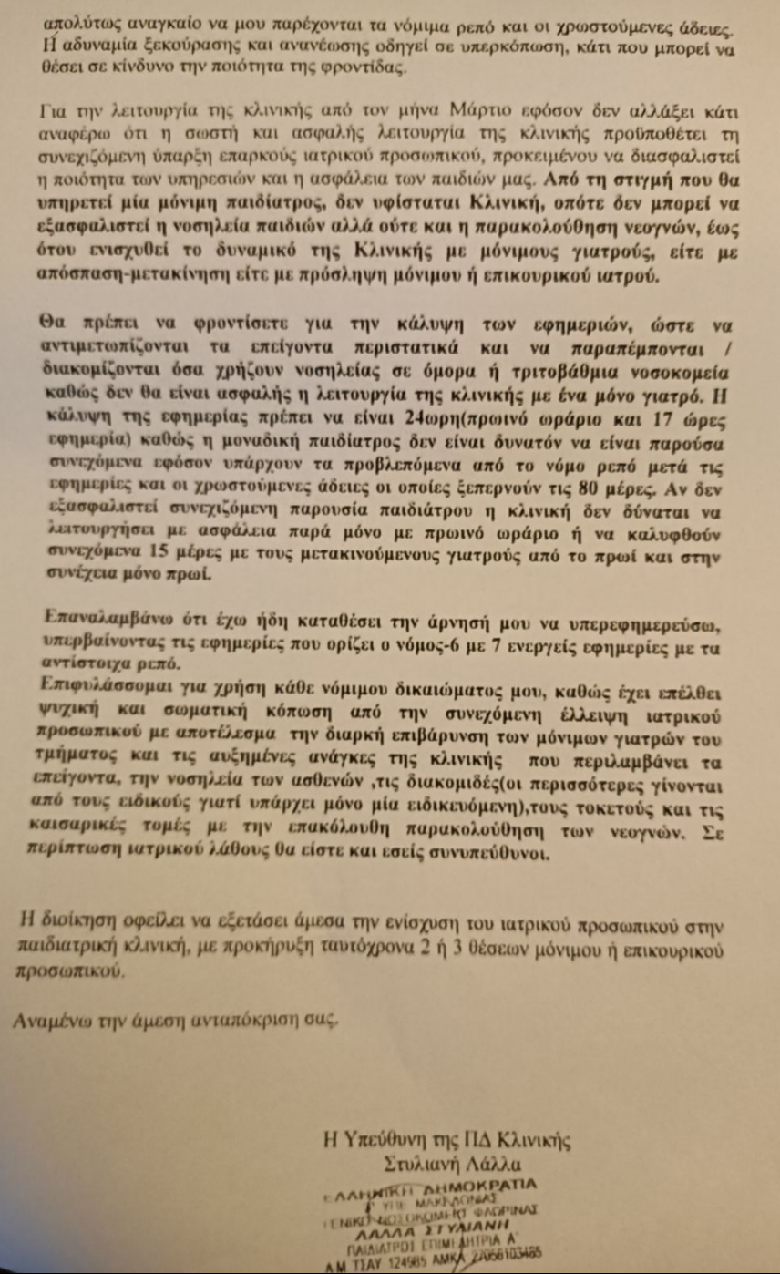 Καταθέτουμε ΑΝΑΦΟΡΑ την επιστολή της Υπεύθυνης της Παιδιατρικής Κλινικής στο Γενικό Νοσοκομείο Φλώρινας, στην οποία αναδεικνύει το σοβαρό ζήτημα της επισφαλούς λειτουργίας της κλινικής, λόγω έλλειψης ιατρικού προσωπικού, και ζητά την άμεση ενίσχυση της.