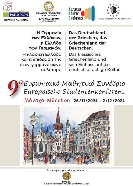Σας ενημερώνουμε ότι το 9ο Ευρωπαϊκό Μαθητικό Συνέδριο, μετά την επιτυχημένη διαδρομή των Ευρωπαϊκών Μαθητικών Συνεδρίων, με σταθμούς την Κωνσταντινούπολη (2014), την Τεργέστη (2015), τη Λευκωσία (2016), το Βελιγράδι (2017), τη Νάπολη (2018), τη Βενετία (2019), τη Βερόνα (Μάρτιος 2023), τη Ρώμη (Νοέμβριος 2023) και το Παρίσι (Φεβρουάριος 2024), θα διεξαχθεί στο Μόναχο (26 Νοεμβρίου-2 Δεκεμβρίου 2024) με θέμα: