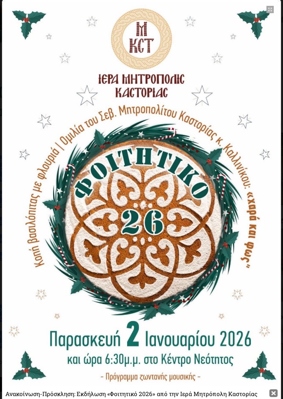Η Ιερά Μητρόπολη Καστορίας, στο πλαίσιο της ποιμαντικής των νέων διοργανώνει και εφέτος την εκδήλωση «ΦΟΙΤΗΤΙΚΟ 2026», με ευλόγηση και κοπή της Βασιλόπιτας και ομιλία από τον Μητροπολίτη μας, για όλους τους φοιτητές, τις φοιτήτριες, τους νέους και τις νέες.