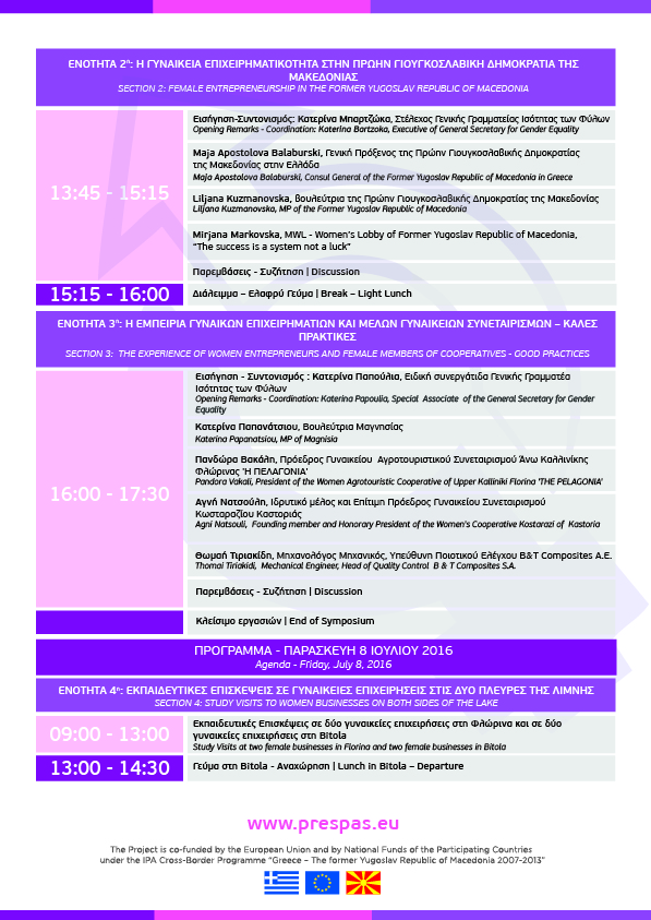 PRESPAS-SYMPOSIUMΗ Γενική Γραμματεία Ισότητας των Φύλων διοργανώνει στη Φλώρινα διήμερο Διεθνές Συμπόσιο με θέμα: «Γυναίκες των Πρεσπών – Γυναίκες του Κόσμου. Οι Γυναίκες των Πρεσπών Επιχειρούν», στις 7 & 8 Ιουλίου 2016.