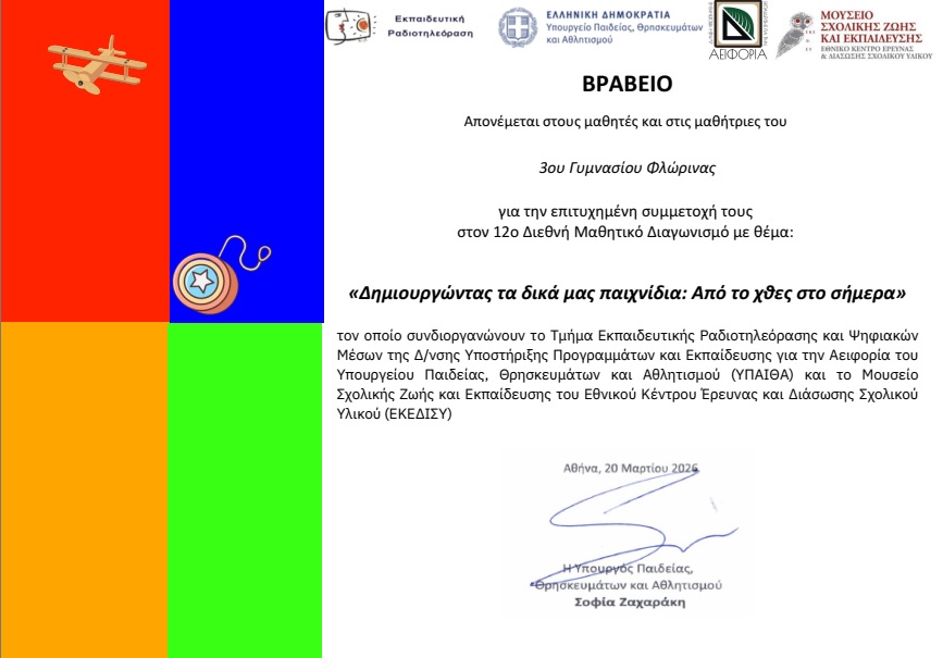 Συγχαρητήριο στις μαθήτριες του 3ου Γυμνασίου Φλώρινας Σαπαλίδου Ειρήνη και Σβάρνα Αικατερίνη για τη βράβευση του επιτραπέζιου παιχνιδιού “Chemie–Poly” στον 12ο Μαθητικό Διαγωνισμό του ΕΚΕΔΙΣΥ «Δημιουργώντας τα δικά μας παιχνίδια: Από το χθες στο σήμερα»
