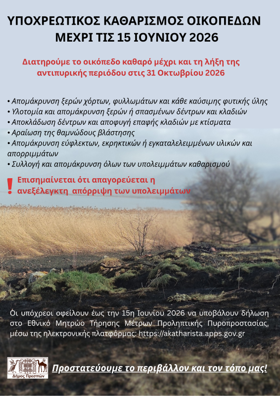 Ο Δήμος Πρεσπών ενημερώνει τους ιδιοκτήτες, νομείς, επικαρπωτές, μισθωτές και υπομισθωτές οικοπέδων και λοιπών ακάλυπτων χώρων που βρίσκονται εντός των διοικητικών του ορίων, ότι σύμφωνα με τις διατάξεις των άρθρων 41, 43 & 44 του Ν. 5281/2026, καθώς και την υπ’ αριθ. 21837 οικ. Φ.700.20/2024 Απόφαση του Υφυπουργού Κλιματικής Κρίσης και Πολιτικής Προστασίας, υποχρεούνται να προβούν στον καθαρισμό των ιδιοκτησιών τους.