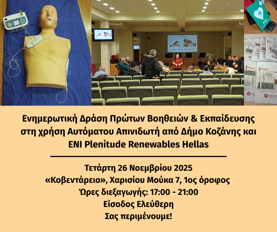 Ο Δήμος Κοζάνης με την ευγενική υποστήριξη της ENI Plenitude Renewables Hellas, διοργανώνει ενημερωτική δράση Πρώτων Βοηθειών & Εκπαίδευσης στη χρήση Αυτόματου Απινιδωτή, με στόχο την ενίσχυση της ετοιμότητας της τοπικής κοινότητας και την απόκτηση βασικών δεξιοτήτων αντιμετώπισης επειγόντων περιστατικών.