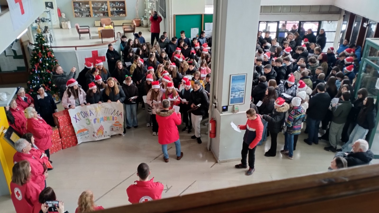 Ees Florinas GiortiΔ) Γιορτινή Επίσκεψη-Υποδοχή: Οι Μαθητές/τριες του 3ου Γυμνασίου Φλώρινας συνοδευόμενοι από τους Εκπαιδευτικούς και το Σύλλογο Γονέων του σχολείου, σε συνεργασία με τη Δ/νση Εθελοντισμού του Δήμου Φλώρινας, επισκέφθηκαν στις 22/12/25 το Τμήμα του Ερυθρού Σταυρού στη Φλώρινα προσφέροντας πολύτιμο υγειονομικό υλικό και εξοπλισμό για τις ανάγκες περίθαλψης αναξιοπαθούντων πασχόντων που τακτικά υποστηρίζονται από τις Εθελόντριες Υγείας του Τμήματος. Μέσα σε γιορτινό κλίμα έγιναν σύντομες προσφωνήσεις από την Διευθύντρια του 3ου Γυμνασίου κα Χριστίνα Καραγιάννη, την Αντιπρόεδρο Συλλόγου Γονέων κα Κωνσταντίνα Κυρατζή και τον Αντιδήμαρχο Φλώρινας κ. Μιχάλη Χάτζιο, οι οποίοι αναφέρθηκαν με θερμά λόγια στο πολυσχιδές έργο που παρέχει το Τμήμα του ΕΕΣ στη Φλώρινα. Ο Αντιπρόεδρος του Τμήματος κ.Πέτρος Μπεδέλης εξέφρασε εγκάρδιες ευχαριστίες για τη συνολική αναγνώριση καθώς και τη συγκεκριμένη χρήσιμη προσφορά, και ο Υπεύθυνος Νεότητας του Τμήματος κ. Ευθύμιος Ψαλλίδας προσκάλεσε τους Μαθητές/τριες να εγγραφούν στην ομάδα Νεότητας του Ερυθρού Σταυρού στη Φλώρινα, ώστε να γνωρίσουν εκτενέστερα τον Ερυθροσταυρικό Εθελοντισμό, ενώ η Προϊσταμένη Νοσηλεύτρια – Εκπαιδεύτρια αναφέρθηκε στην αξία της καθημερινής προσωπικής στάσης και πράξης καθενός μας απέναντι στις ποικίλες δυσχέρειες των συνανθρώπων μας. Οι μαθητές/τριες τραγούδησαν τα κάλαντα με τη συνοδεία μουσικών οργάνων, υπό την καθοδήγηση του εκπαιδευτικού μουσικού κ. Λαέρτη Κούλη, και η επίσκεψη έληξε με την ανταλλαγή αναμνηστικών δώρων και χαρούμενων χριστουγεννιάτικων ευχών από όλους, μέσα σε μια ατμόσφαιρα γιορτινή αλλά και συγκινητική.