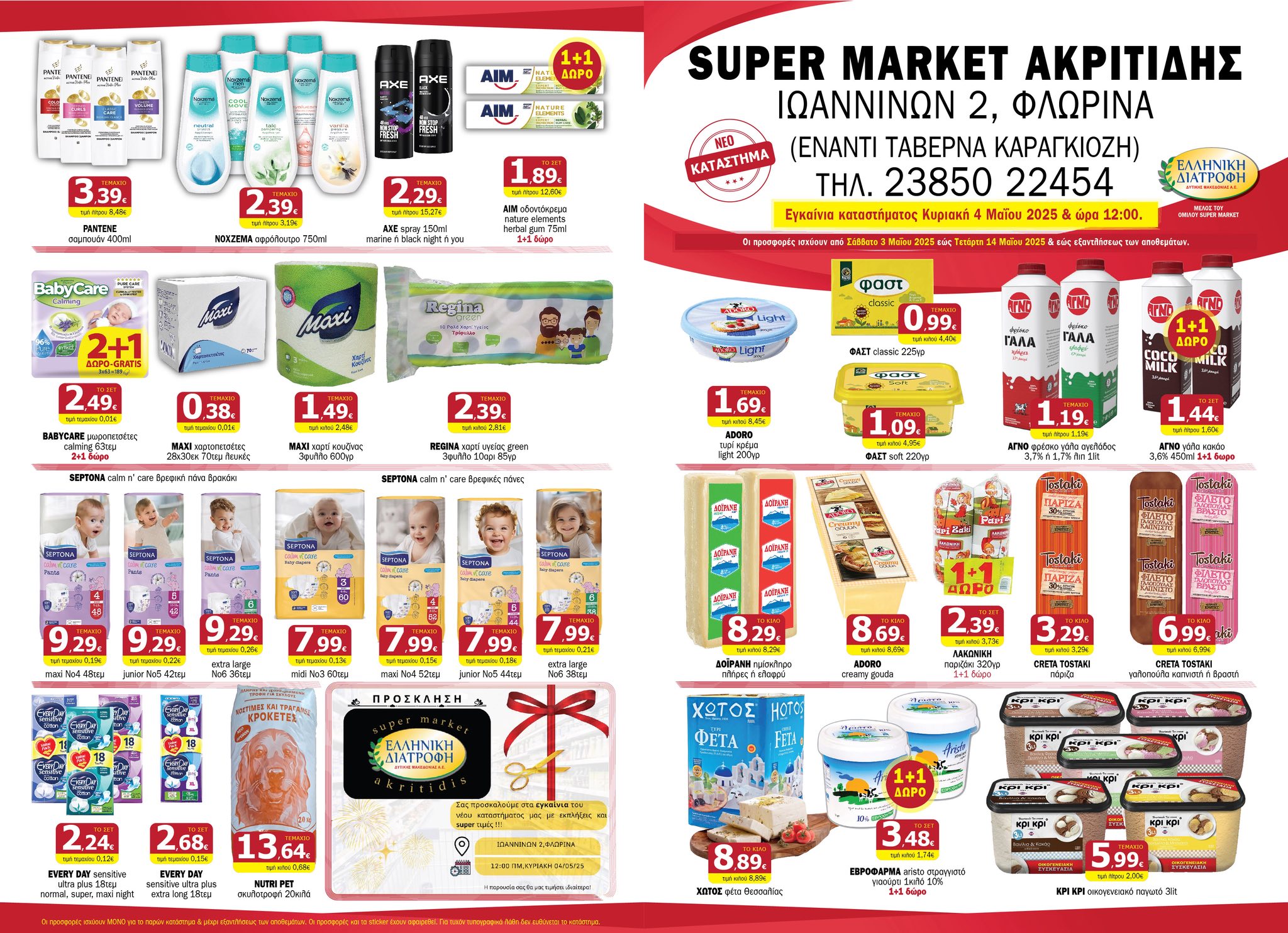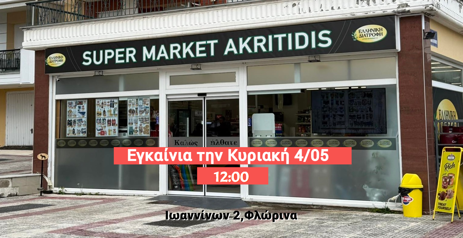 Το Σούπερ Μάρκετ Ελληνική Διατροφή Ακριτίδης σας περιμένει καθημερινά με 2 καταστήματα στην πόλη της Φλώρινας στην οδό Ιωαννίνων 2 (έναντι ταβέρνας καραγκιόζη) και στο Αμμοχώρι Φλώρινας.