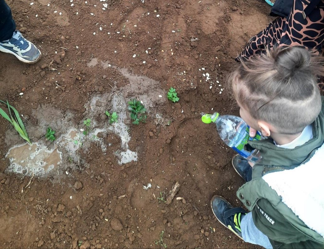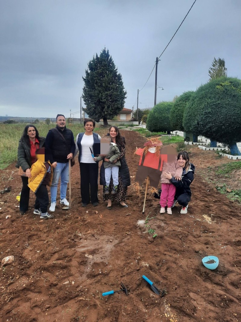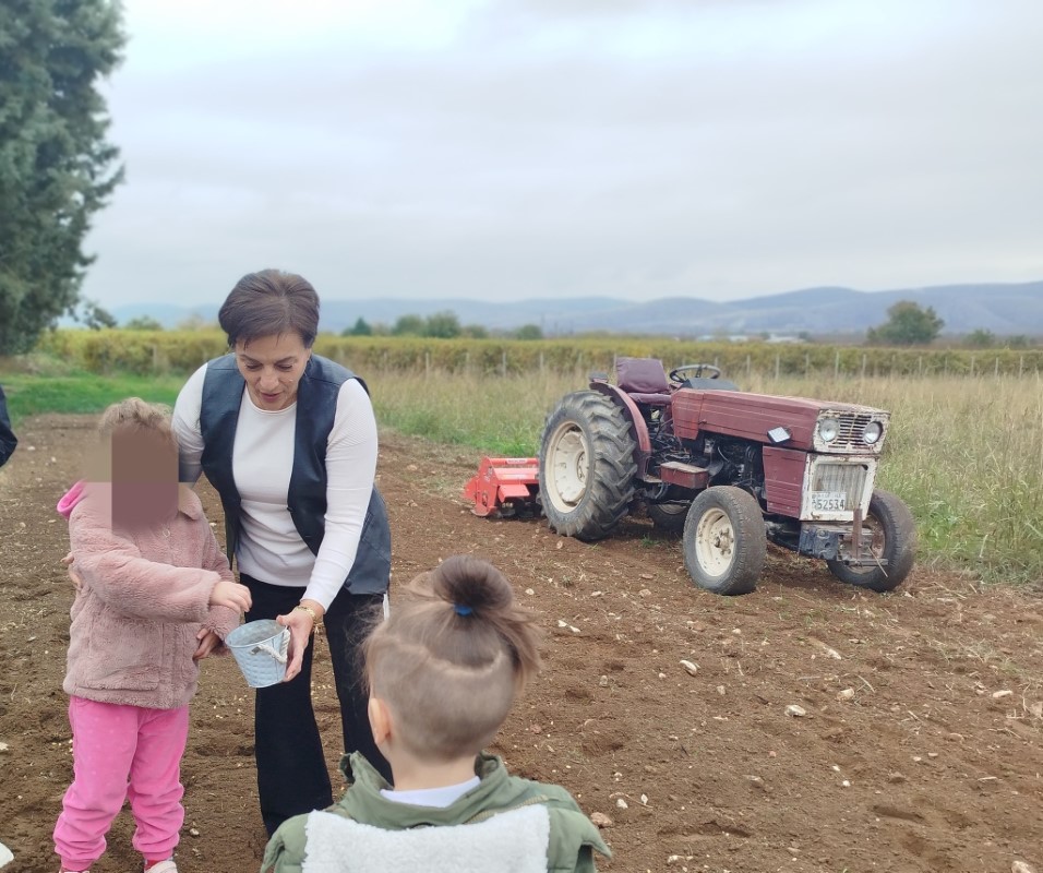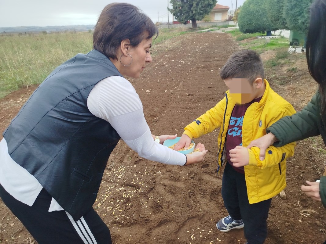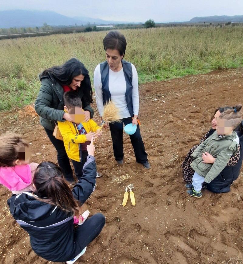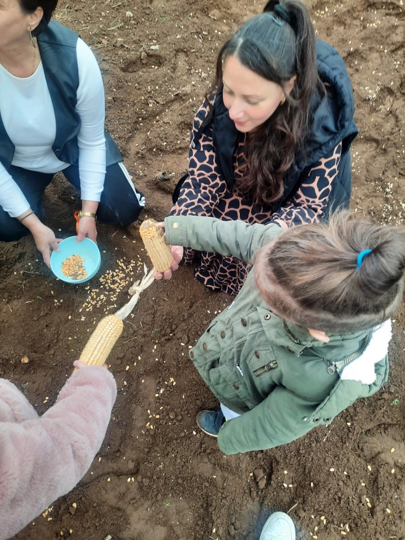Αρχικά μας αφηγήθηκε τον τρόπο με τον οποίο παλαιότερα έσπερναν οι αγρότες σιτάρι και καλαμπόκι… Έπειτα, πήγαμε σε ένα χωράφι και βιωματικά τσαπίσαμε, σπείραμε, ποτίσαμε. Δεν παραλείψαμε να τοποθετήσουμε και ένα σκιάχτρο στο χωράφι, ώστε να το βλέπουν τα πουλιά και να φοβούνται για να μην τρώνε τα σποράκια που φυτέψαμε…
