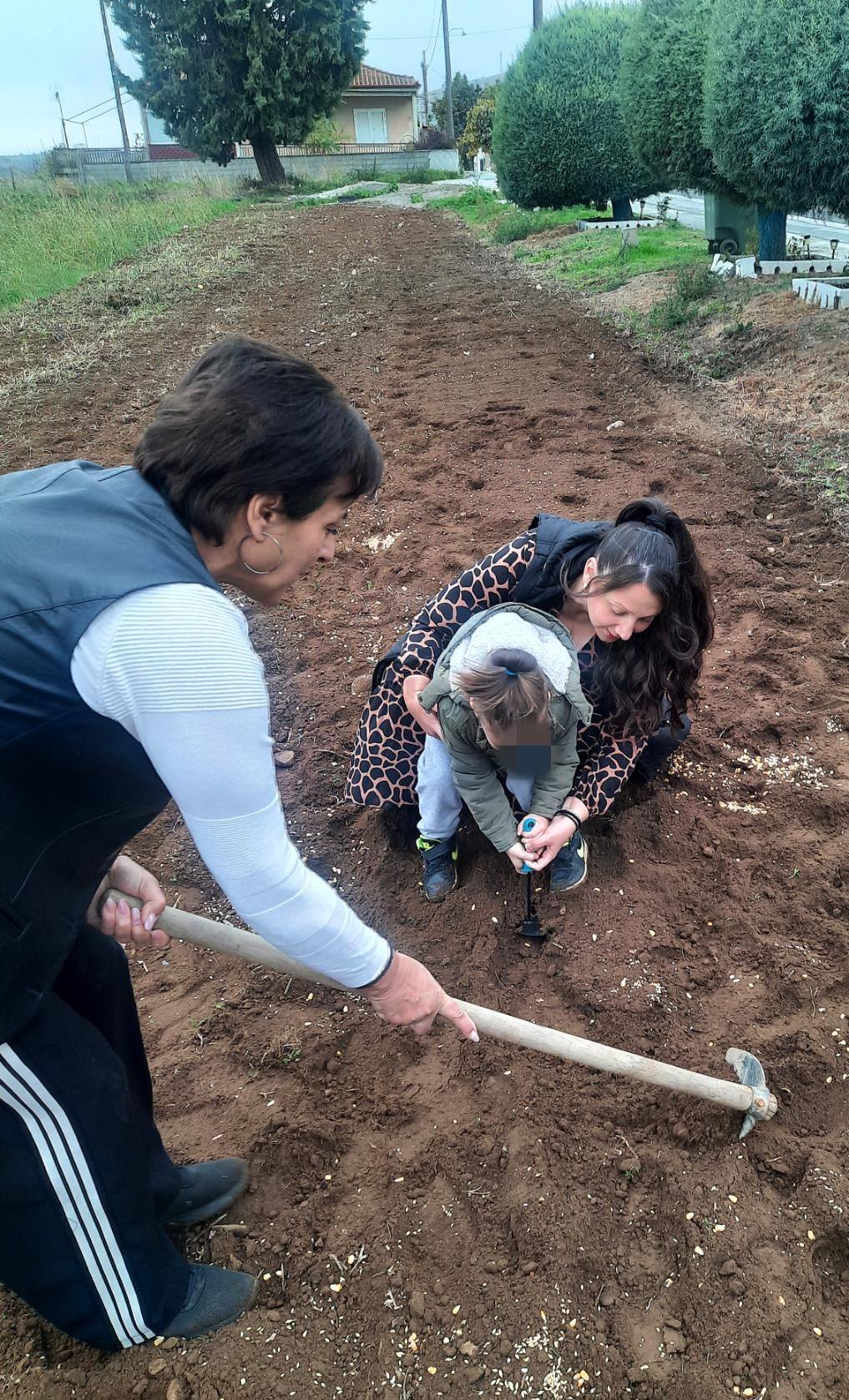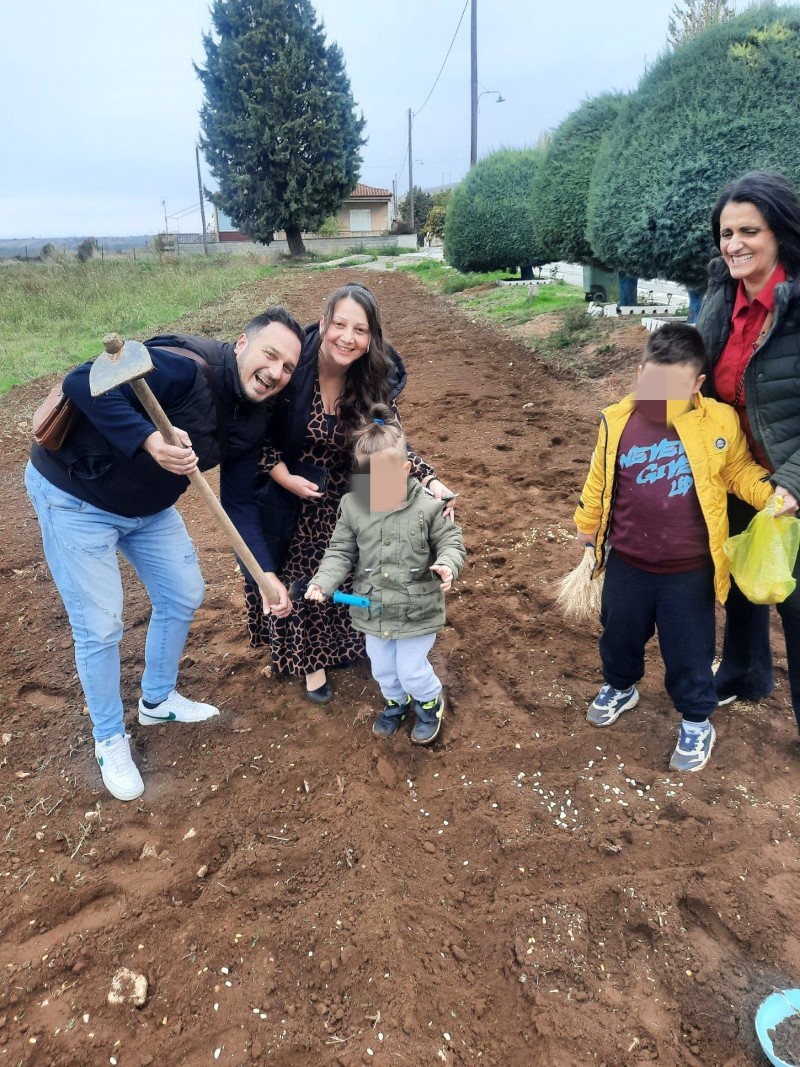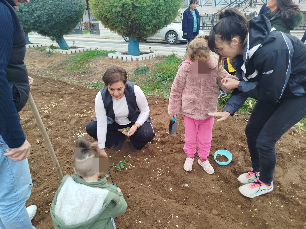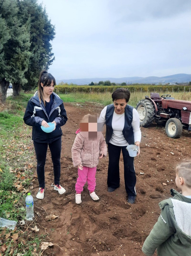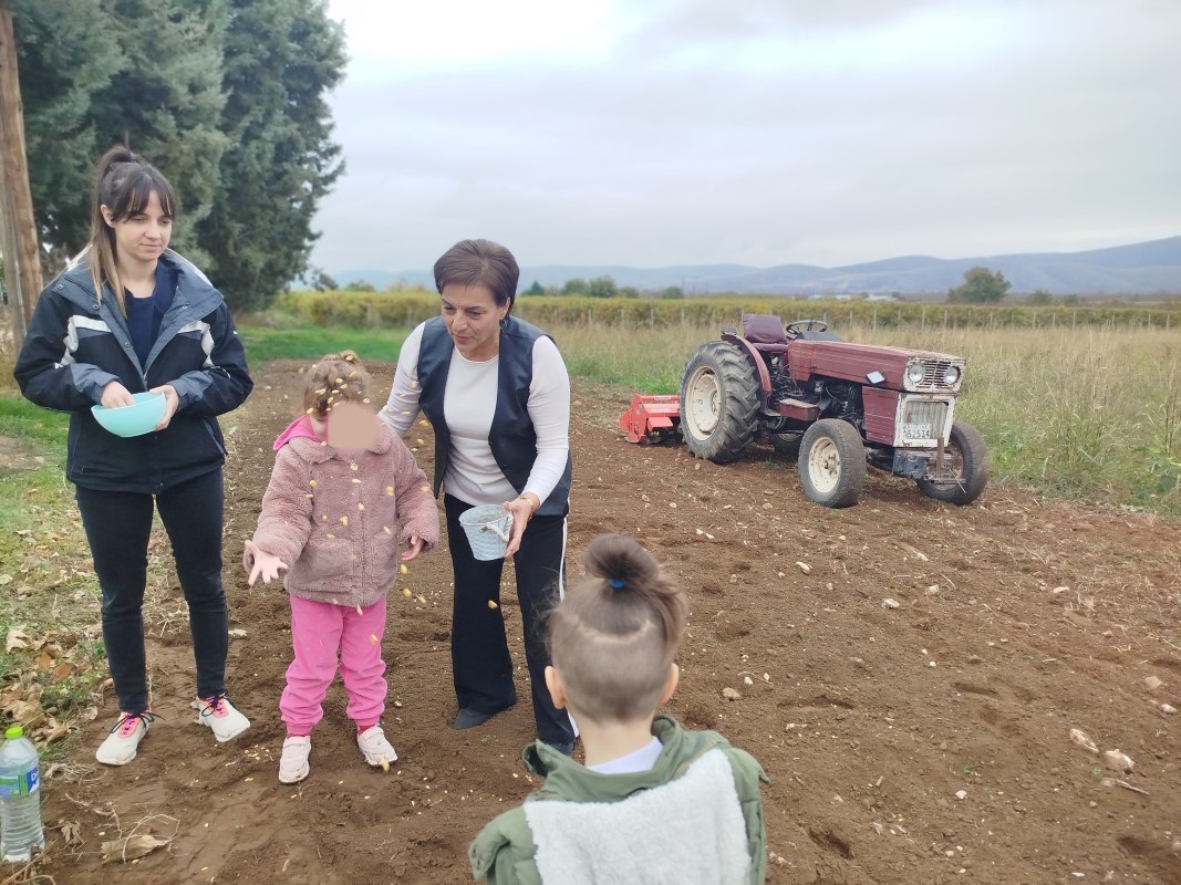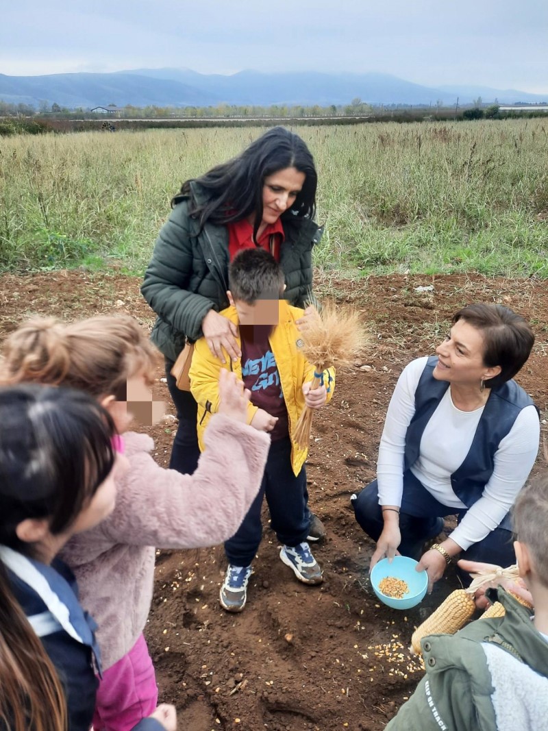 Αρχικά μας αφηγήθηκε τον τρόπο με τον οποίο παλαιότερα έσπερναν οι αγρότες σιτάρι και καλαμπόκι… Έπειτα, πήγαμε σε ένα χωράφι και βιωματικά τσαπίσαμε, σπείραμε, ποτίσαμε. Δεν παραλείψαμε να τοποθετήσουμε και ένα σκιάχτρο στο χωράφι, ώστε να το βλέπουν τα πουλιά και να φοβούνται για να μην τρώνε τα σποράκια που φυτέψαμε…