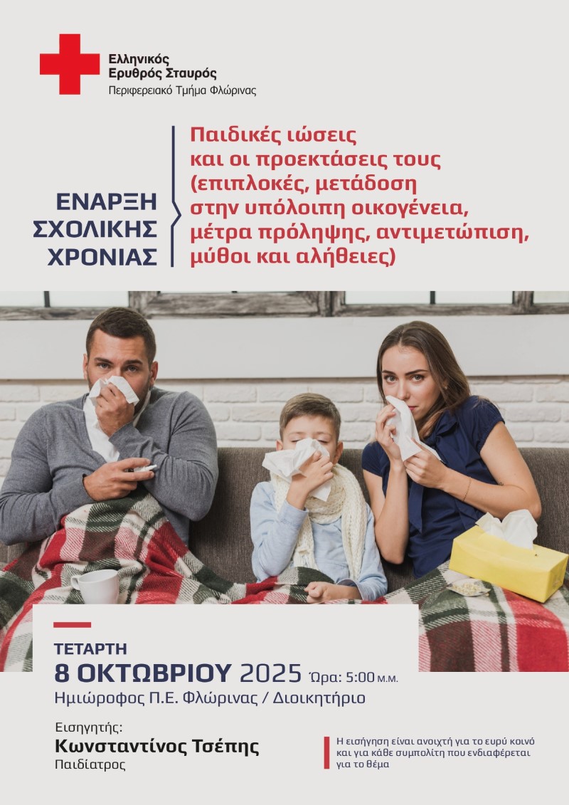 Το Περιφερειακό Τμήμα Φλώρινας του Ελληνικού Ερυθρού Σταυρού ξεκινά και πάλι τη νέα εκπαιδευτική περίοδο με τη συνέχιση του θεσμού των Μηνιαίων Επιμορφωτικών Συγκεντρώσεων των Εθελοντών και των Μελών του. Σε αυτό το πλαίσιο την προσεχή Τετάρτη 8 Οκτωβρίου 2025 και ώρα 5:00μμ στον ημιώροφο του Διοικητηρίου της Περιφερειακής Ενότητας Φλώρινας, προσκεκλημένος εισηγητής θα είναι ο Ειδικός Παιδίατρος – Επιστημονικός Συνεργάτης της Β΄ Πανεπιστημιακής Κλινικής ΑΧΕΠΑ, κ. Κωνσταντίνος Τσέπης, που θα αναπτύξει το Θέμα: «ΕΝΑΡΞΗ ΣΧΟΛΙΚΗΣ ΧΡΟΝΙΑΣ: Παιδικές ιώσεις και οι προεκτάσεις τους (επιπλοκές, μετάδοση στην υπόλοιπη οικογένεια, μέτρα πρόληψης, αντιμετώπιση, μύθοι και αλήθειες)»