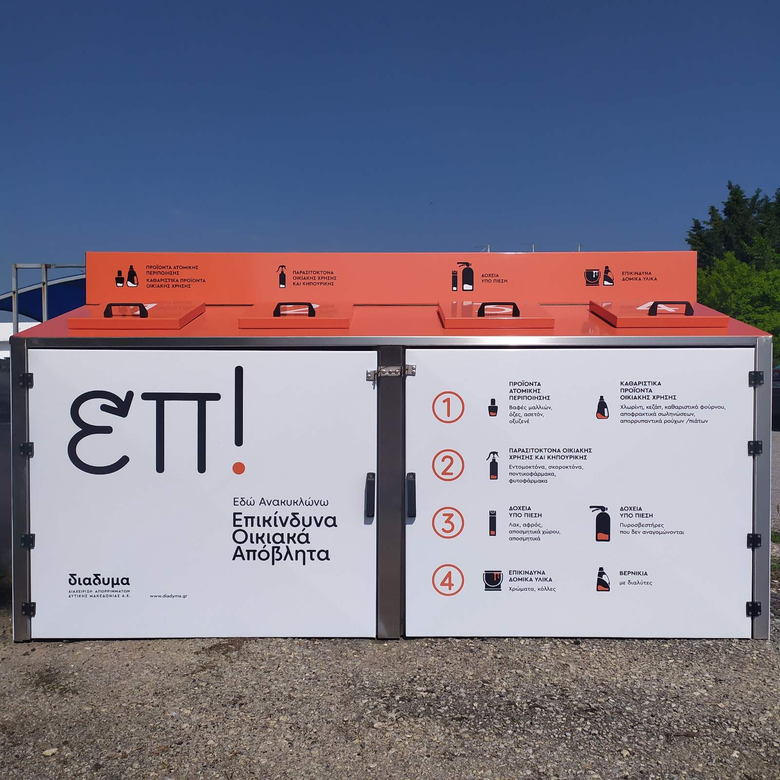 Διευκρινίζεται ότι: για τις Οικιακές Μπαταρίες, τους Λαμπτήρες, τις μικρές Ηλεκτρικές & Ηλεκτρονικές Συσκευές και τα Ληγμένα Φάρμακα, που ήδη εφαρμόζονται προγράμματα χωριστής συλλογής τους, οι πολίτες θα πρέπει να αναζητούν τους ειδικούς κάδους σε καταστήματα, υπηρεσίες και στις εγκαταστάσεις της ΔΙΑΔΥΜΑ (πληροφορίες στο diadyma.gr ή στα social media της ΔΙΑΔΥΜΑ).