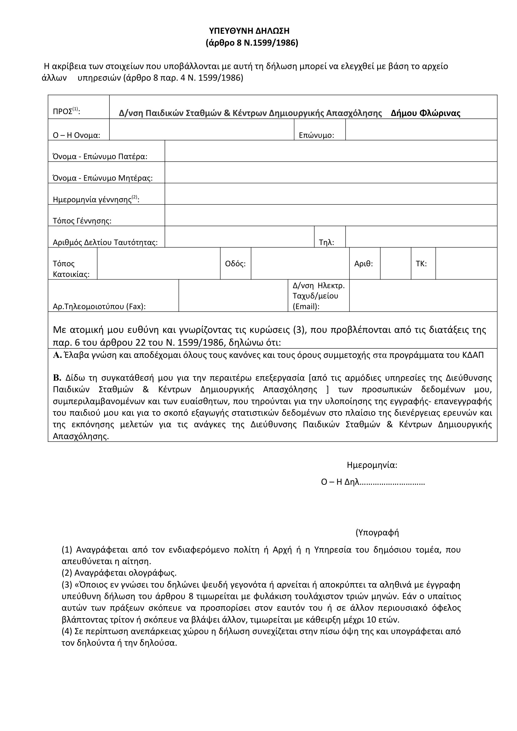 - 4. Υπεύθυνη Δήλωση του Ν.1599/1986 με την οποία ο γονέας θα δηλώνει τη συγκατάθεσή του για την περαιτέρω επεξεργασία (από τις αρμόδιες υπηρεσίες της Διεύθυνσης Παιδικών Σταθμών & Κέντρων Δημιουργικής Απασχόλησης Παιδιών) των προσωπικών δεδομένων τους, συμπεριλαμβανομένων και των ευαίσθητων, που τηρούνται για την υλοποίησης της εγγραφής- επανεγγραφής των παιδιών και για το σκοπό εξαγωγής στατιστικών δεδομένων στο πλαίσιο της διενέργειας ερευνών και της εκπόνησης μελετών για τις ανάγκες της Διεύθυνσης Παιδικών Σταθμών & Κέντρων Δημιουργικής Απασχόλησης Παιδιών