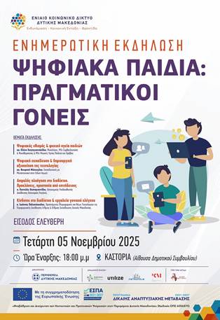 Το Ενιαίο Κοινωνικό Δίκτυο Δυτικής Μακεδονίας προσκαλεί γονείς, εκπαιδευτικούς και κάθε ενδιαφερόμενο πολίτη στην ενημερωτική εκδήλωση με τίτλο «Ψηφιακά Παιδιά – Πραγματικοί Γονείς», που θα πραγματοποιηθεί την Τετάρτη 5 Νοεμβρίου 2025, στις 18:00, στην Αίθουσα Δημοτικού Συμβουλίου Καστοριάς.