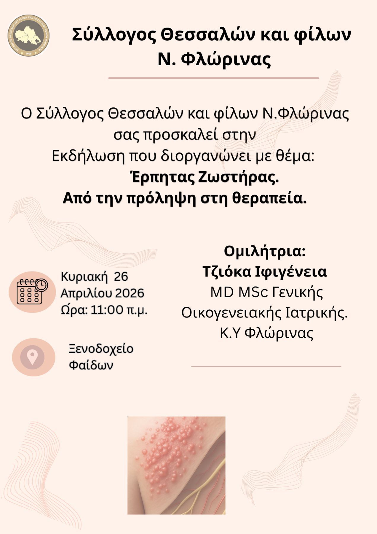 Το Δ.Σ. του Συλλόγου Θεσσαλών και φίλων Ν. Φλώρινας σας προσκαλεί σε ενημερωτική εκδήλωση με θέμα τον Έρπητα Ζωστήρα, την Κυριακή 26 Απριλίου στις 11:00 π.μ. στο Ξενοδοχείο Φαίδων.