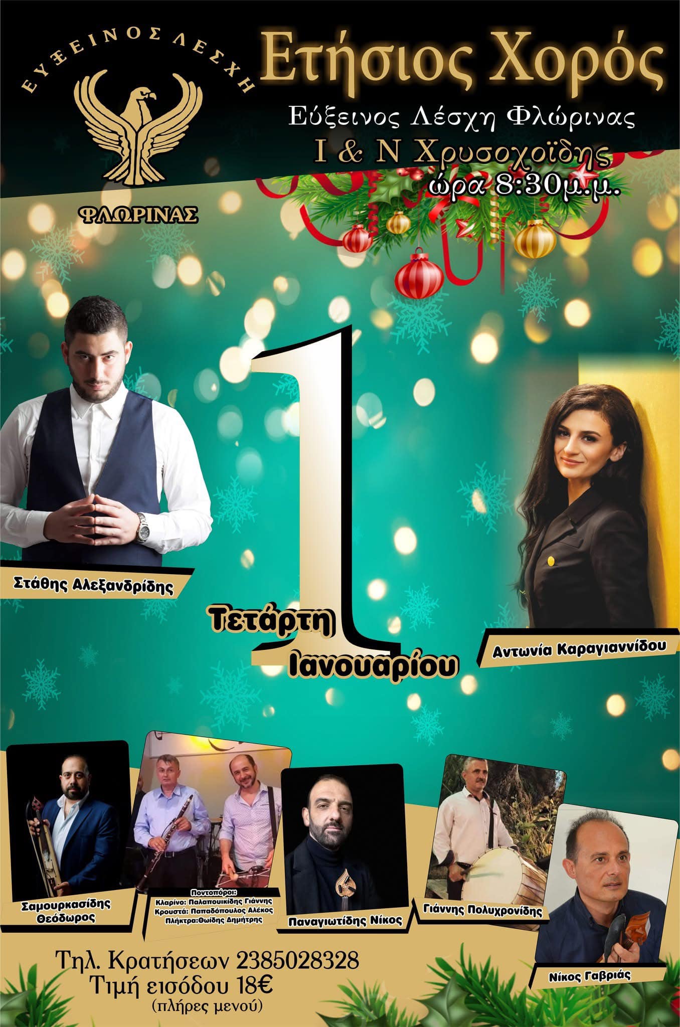 Ο Πρόεδρος και το Δ.Σ. της Ευξείνου Λέσχης Φλώρινας σας καλούν να τιμήσετε με την παρουσία σας τον ετήσιο πρωτοχρονιάτικο χορό που θα διεξαχθεί στην αίθουσα δεξιώσεων «Ι&Ν Χρυσοχοϊδης» την Τετάρτη 01/01/2025 και ώρα 20:30 μμ.