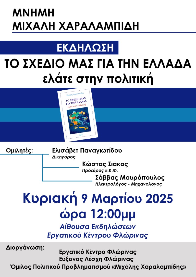 Σας προσκαλούμε να μας τιμήσετε με την παρουσία σας στην εκδήλωση που διοργανώνουμε την Κυριακή 9 Μαρτίου 2025 και ώρα 12:00 στην Αίθουσα Εκδηλώσεων του Εργατικού Κέντρου Φλώρινας.