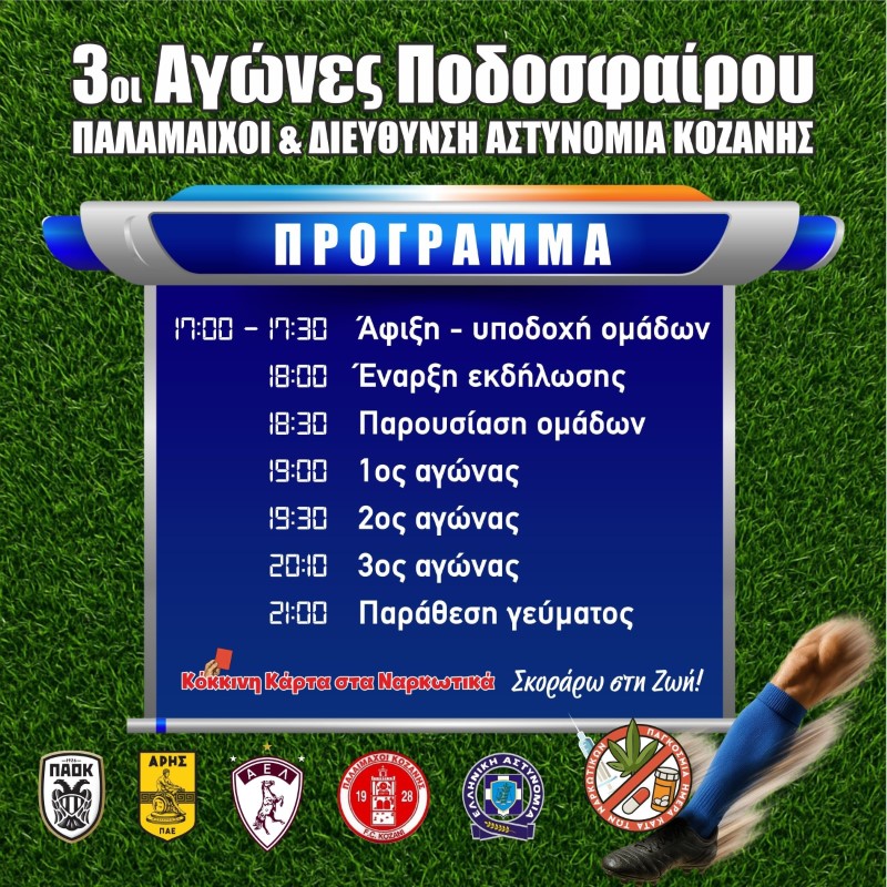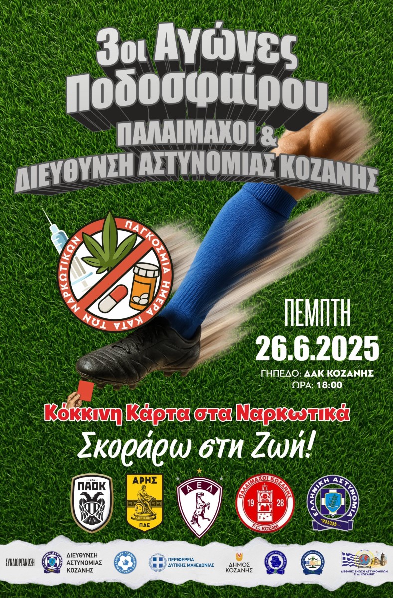 Με αφορμή την Παγκόσμια Ημέρα κατά των Ναρκωτικών και της Διακίνησης τους που είναι 26 Ιουνίου, η Διεύθυνση Αστυνομίας Κοζάνης για τρίτη συνεχή χρονιά, συνδιοργανώνει με την Ελληνική Ποδοσφαιρική Ομοσπονδία Περιφέρειας Δυτικής Μακεδονίας και Δήμου Κοζάνης, τις Ενώσεις Αξιωματικών Ελληνικής Αστυνομίας Δυτικής Μακεδονίας, Αστυνομικών Υπαλλήλων Νομού Κοζάνης και της Τοπικής Διοίκησης Κοζάνης (Ι.Ρ.Α) της Διεθνούς Ένωσης Αστυνομικών, Τουρνουά Ποδοσφαίρου, με κεντρικό μήνυμα «Κόκκινη κάρτα στα Ναρκωτικά .… Σκόραρω στη Ζωή» .