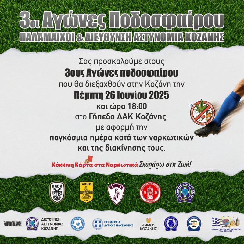 Με αφορμή την 26η Ιουνίου που έχει καθιερωθεί ως «Παγκόσμια Ημέρα κατά των Ναρκωτικών και της Διακίνησής τους» η Διεύθυνση Αστυνομίας Κοζάνης, διοργανώνει για 3η συνεχόμενη χρονιά Τουρνουά Ποδοσφαίρου, με κεντρικό μήνυμα