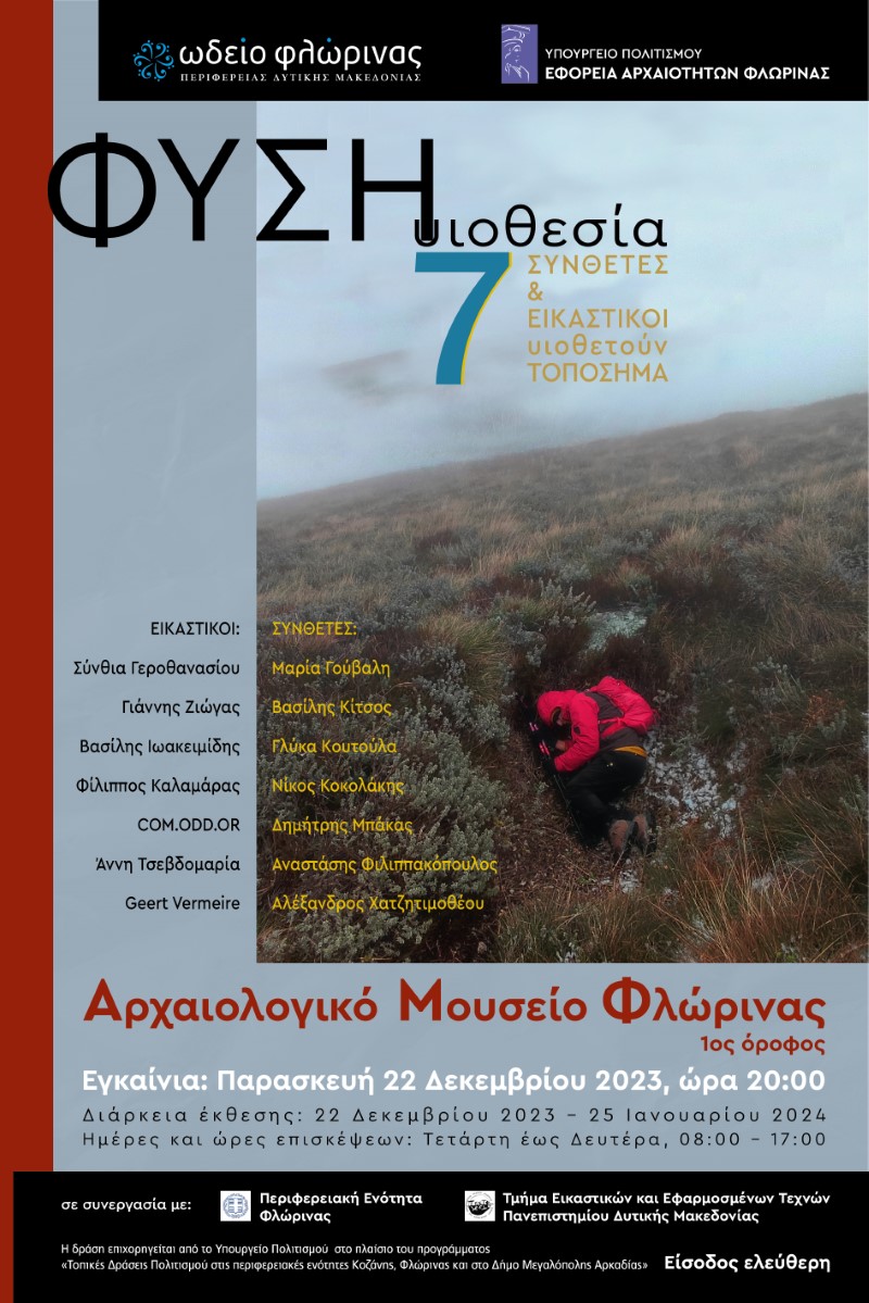 Η Εφορεία Αρχαιοτήτων Φλώρινας σας προσκαλεί στα εγκαίνια της εικαστικής έκθεσης-ηχητικής εγκατάστασης με τίτλο «ΦΥΣΗυιοθεσία», που θα πραγματοποιηθούν στο Αρχαιολογικό Μουσείο Φλώρινας την Παρασκευή 22 Δεκεμβρίου 2023 και ώρα 20:00 με ελεύθερη είσοδο για το κοινό.