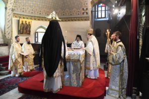 Της Τρισαρχιερατικής Θείας Λειτουργίας προεξήρχε ο Μητροπολίτης Γέρων Πριγκηποννήσων Δημήτριος, συλλειτουργούντων των Μητροπολιτών Ικονίου Θεολήπτου και Καλλιουπούλεως και Μαδύτου Στεφάνου.