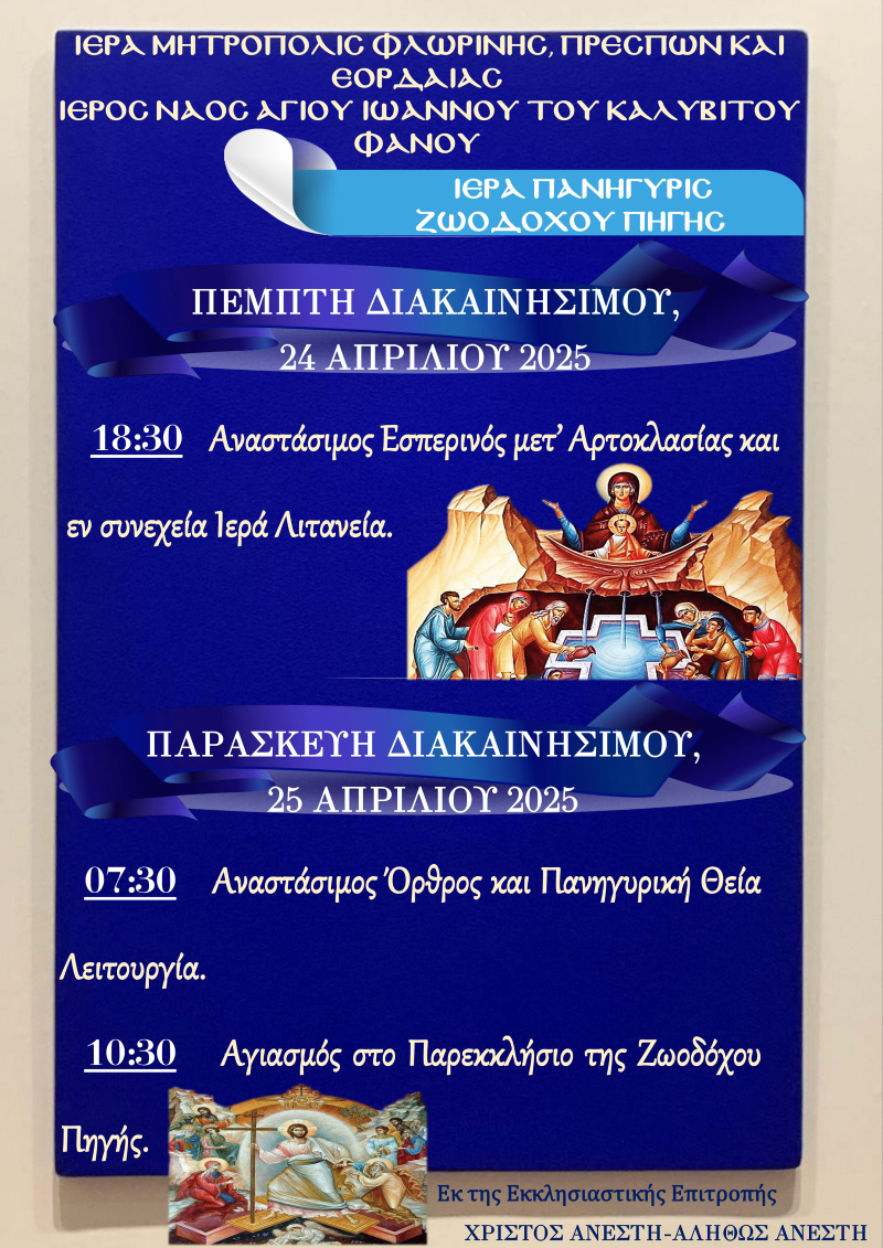 18:30 Αναστάσιμος Εσπερινός μετ’ Αρτοκλασίας και εν συνεχεία Ιερά Λιτανεία.