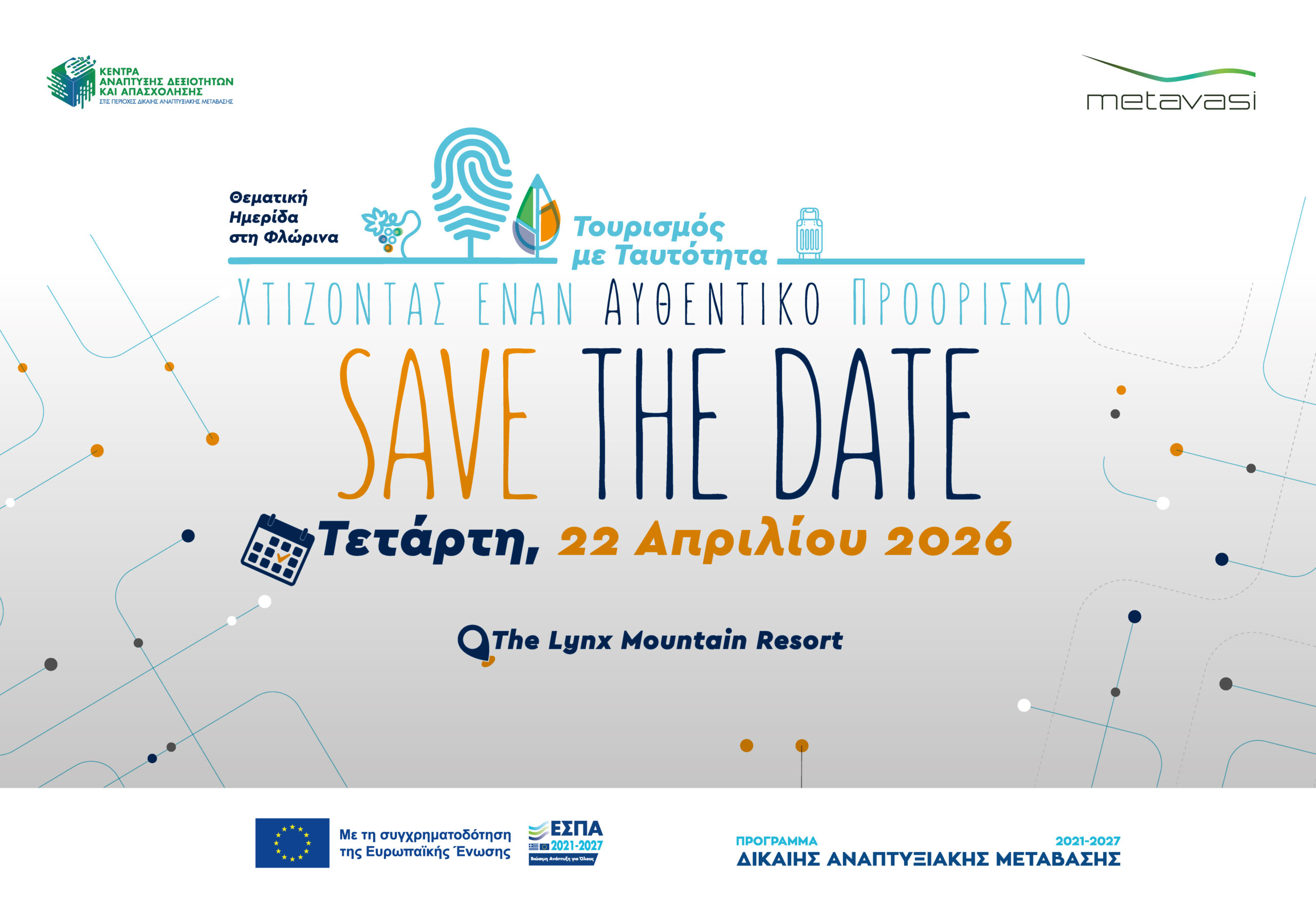 Στο πλαίσιο της δράσης «Κέντρα Ανάπτυξης Δεξιοτήτων και Απασχόλησης στις περιοχές Δίκαιης Αναπτυξιακής Μετάβασης» διοργανώνεται στη Φλώρινα Θεματική Ημερίδα με τίτλο «Φλώρινα: Τουρισμός με Ταυτότητα – Χτίζοντας έναν Αυθεντικό Προορισμό», με στόχο την ανάδειξη και ενίσχυση του τουριστικού προϊόντος της περιοχής, μέσω της σύνδεσης της τοπικής ταυτότητας και παραγωγής με τις σύγχρονες μορφές τουρισμού, καθώς και με την ανάπτυξη δεξιοτήτων και νέων ευκαιριών για το ανθρώπινο δυναμικό.