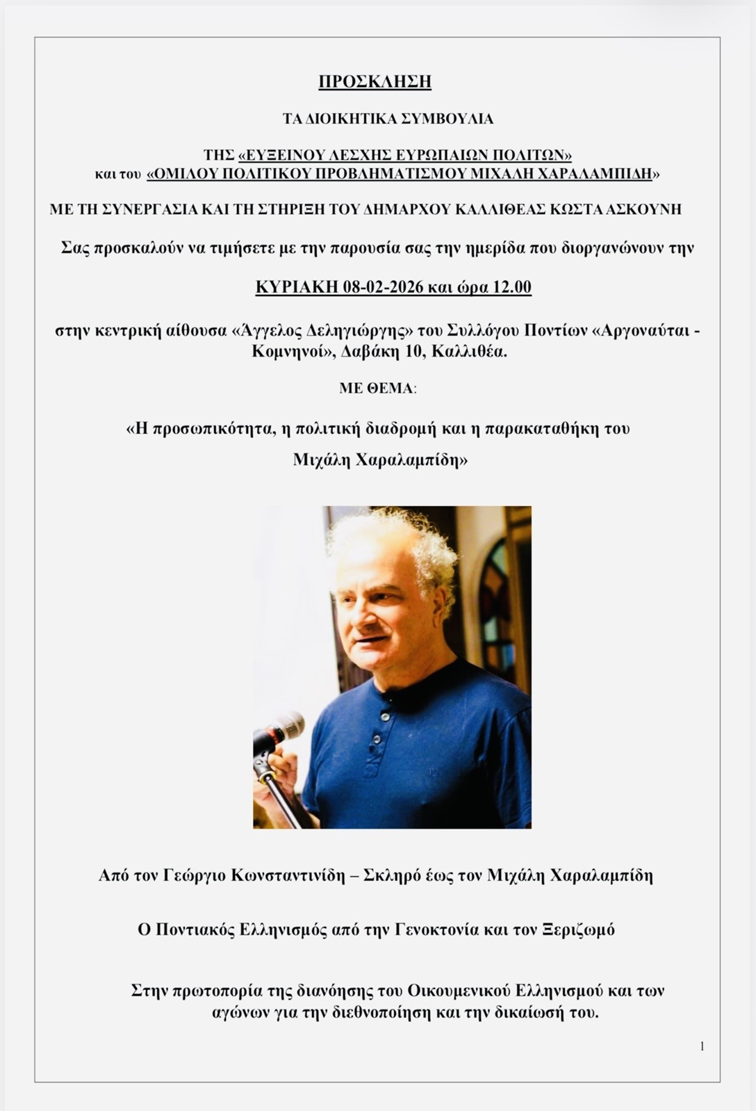 Ημερίδα Η προσωπικότητα η πολιτική διαδρομή και η παρακαταθήκη του Μιχάλη Χαραλαμπίδη στην Καλλιθέα