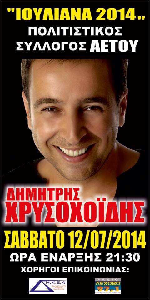 Ο Μορφωτικός Πολιτιστικός σύλλογος Αετού σας προσκαλεί το Σάββατο 12 Ιουλίου 2014 στη συναυλία με τον Δημήτρη Χρυσοχοίδη που θα πραγματοποιηθεί στο προαύλιο του Γυμνασίου Αετού στα πλαίσια των εκδηλώσεων Ιουλιανά 2014