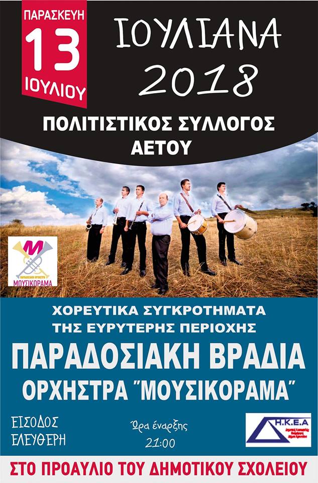 Ο Μορφωτικός Πολιτιστικός Σύλλογος Αετού σας προσκαλεί την Παρασκευή 13 Ιουλίου στις πολιτιστικές εκδηλώσεις που θα πραγματοποιηθούν στον προαύλιο χώρο του Δημοτικού Σχολείου Αετού