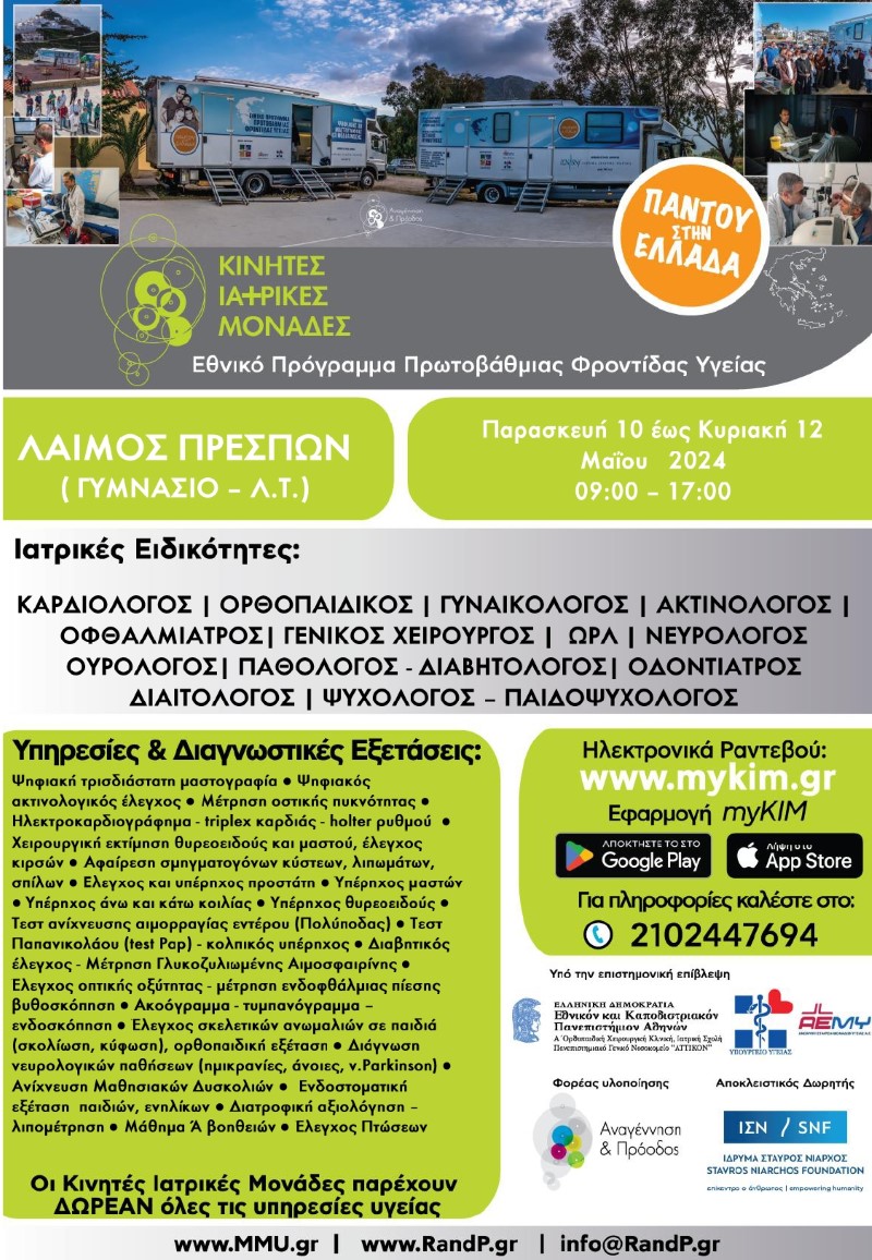 Στο πλαίσιο του Εθνικού Προγράμματος Πρωτοβάθμιας Φροντίδας Υγείας, Κινητές Ιατρικές Μονάδες θα βρίσκονται στις Πρέσπες από τις 10 μέχρι τις 12 Μαΐου 2024. Οι ιατρικές υπηρεσίες παρέχονται δωρεάν σε όλους τους πολίτες, στις ειδικότητες: καρδιολόγος, ορθοπαιδικός, γυναικολόγος, ακτινολόγος, οφθαλμίατρος, γενικός χειρουργός, ΩΡΛ, νευρολόγος, ουρολόγος -παθολόγος διαβητολόγος, οδοντίατρος, διαιτολόγος, ψυχολόγος- παιδοψυχολόγος.