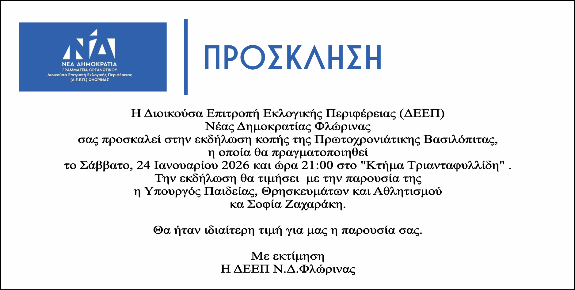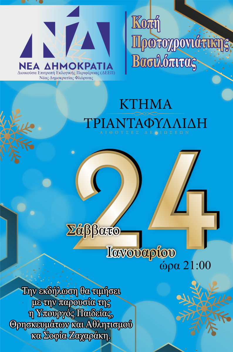 Με την παρουσία της Υπουργού Παιδείας κ Σοφίας Ζαχαράκη η κοπή της Πρωτοχρονιάτικης Βασιλόπιτας της ΔΕΕΠ ΝΔ Φλώρινας