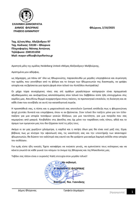 ως Δήμαρχος, μα πάνω απ’ όλα ως Φλωρινιώτης, παρακολουθώ με μεγάλη υπερηφάνεια και συγκίνηση την ομάδα, που γεννήθηκε από τη φλόγα και το όνειρο των Φλωρινιωτών της διασποράς, να γράφει ιστορία και να βρίσκεται για πρώτη φορά στον τελικό του Κυπέλλου Αυστραλίας!