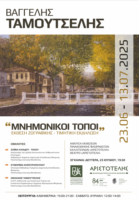 Ο Φιλεκπαιδευτικός Σύλλογος Φλωρίνης «Ο Αριστοτέλης» διοργανώνει την αναδρομική έκθεση ζωγραφικής «Μνημονικοί Τόποι» του Βαγγέλη Ταμουτσέλη καθώς και τιμητική εκδήλωση για τον Φλωρινιώτη καλλιτέχνη.