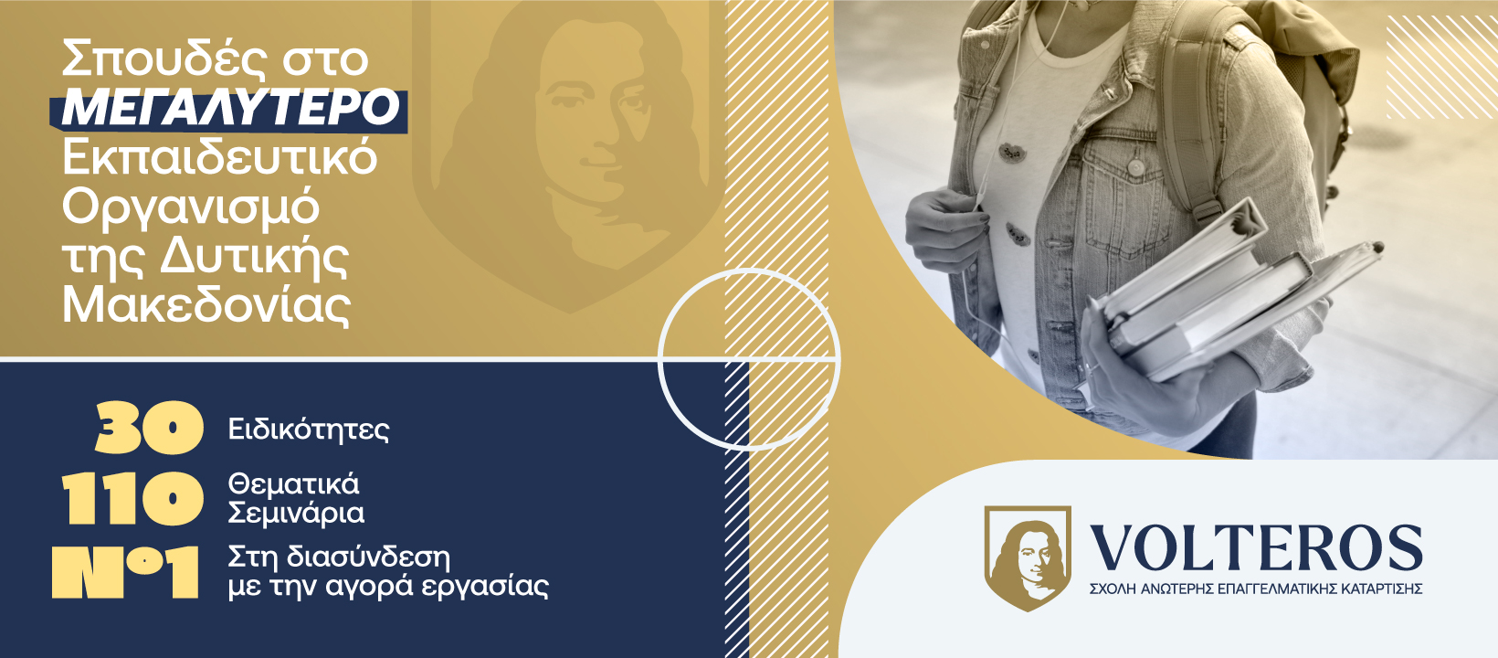 Κλείσε, λοιπόν, σήμερα τη θέση σου στα νέα τμήματα Οκτωβρίου με προνομιακά δίδακτρα, με δωρεάν 2 ξένες γλώσσες και πιστοποιητικό στους Η/Υ όλα αναγνωρισμένα από ΑΣΕΠ και γίνε επιτυχημένος επαγγελματίας! Κρατικό δίπλωμα και αμειβόμενη πρακτική άσκηση όπως σε προτρέπoυν οι Σχολές VOLTEROS