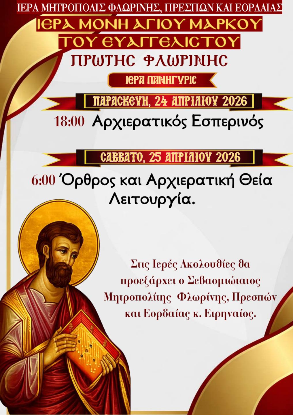 Πανήγυρις Ιεράς Μονής Αγίου Μάρκου του Ευαγγελιστού Πρώτης Φλωρίνης