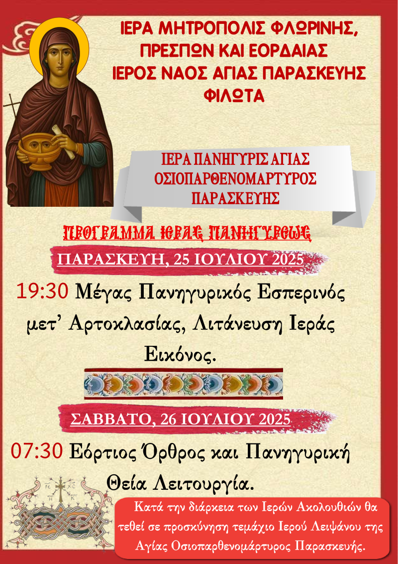Πανηγυρίζει ο Ιερός Ναός Αγίας Παρασκευής Φιλώτα