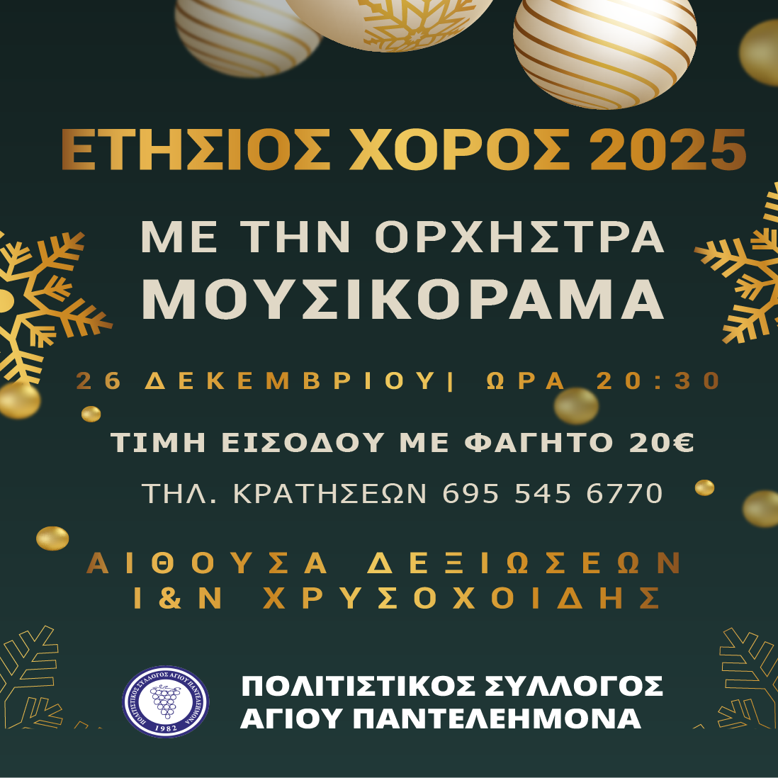 Ο Πολιτιστικός και Μορφωτικός Σύλλογος Αγίου Παντελεήμονα σας προσκαλεί στον ετήσιο χορό του!