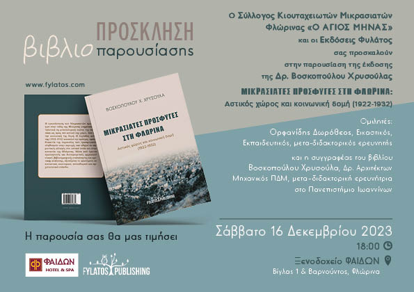 Ο Σύλλογος Κιουταχειωτών – Μικρασιατών Φλώρινας “Ο Άγιος Μηνάς” και οι εκδόσεις Φυλάτος σας προσκαλούν στη Βιβλιοπαρουσίαση της Δρ. Χρυσούλας Βοσκοπούλου με τίτλο “ΜΙΚΡΑΣΙΑΤΕΣ ΠΡΟΣΦΥΓΕΣ ΣΤΗ ΦΛΏΡΙΝΑ: Αστικός χώρος και κοινωνική δομή (1922-1932)” που θα πραγματοποιηθεί το Σάββατο 16 Δεκεμβρίου 2023 και ώρα 18:00 μ.μ. στο ξενοδοχείο ΦΑΙΔΩΝ.