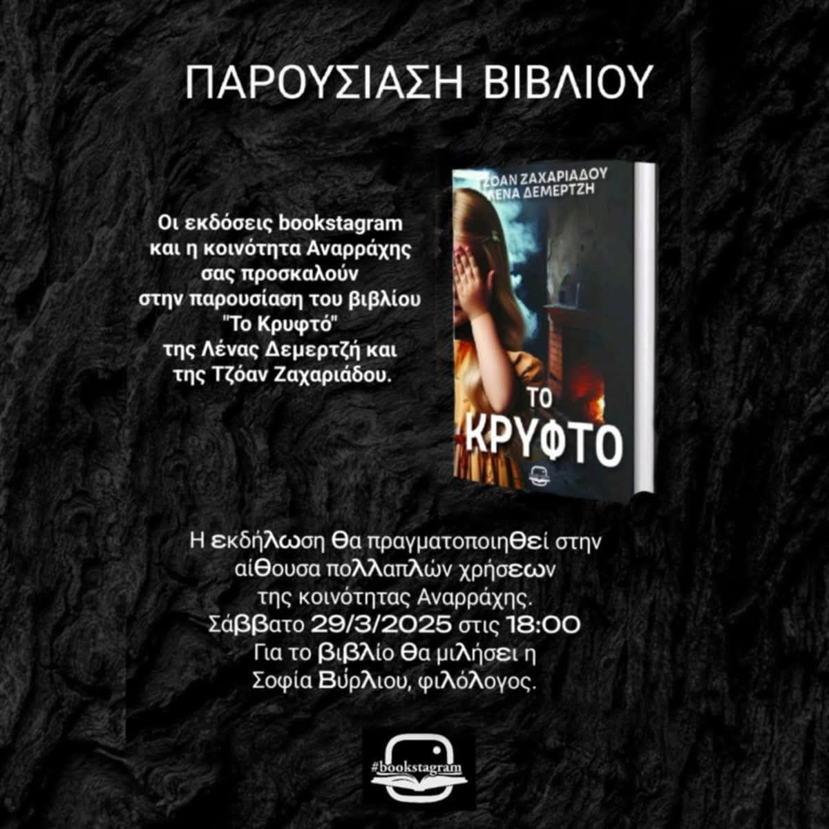 Η Κοινότητα Αναρράχης και οι Εκδόσεις bookstagram έχουν τη χαρά να σας προσκαλέσουν στην παρουσίαση του νέου ψυχολογικού μυθιστορήματος «Το Κρυφτό», μια συγκλονιστική ιστορία που γεννήθηκε από τη συνεργασία δύο αγαπημένων συγγραφέων: Λένας Δεμερτζή και Τζόαν Ζαχαριάδου.