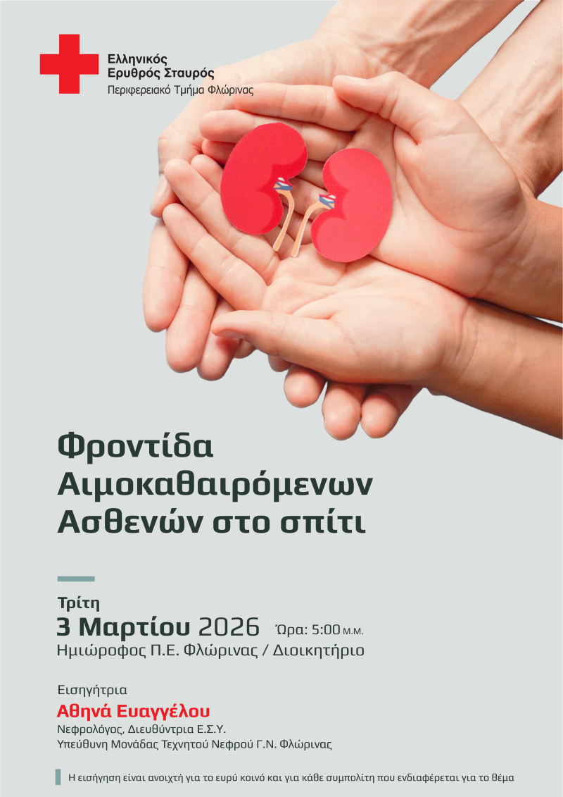 Το Περιφερειακό Τμήμα Φλώρινας του Ελληνικού Ερυθρού Σταυρού συνεχίζει το θεσμό των Μηνιαίων Επιμορφωτικών Συγκεντρώσεων των Εθελοντών και των Μελών του. Σε αυτό το πλαίσιο και με αφορμή την Παγκόσμια Ημέρα Νεφρού, την προσεχή Τρίτη 3 Μαρτίου 2026 και ώρα 5:00μμ στον ημιώροφο του Διοικητηρίου της Π.Ε. Φλώρινας, προσκεκλημένη Εισηγήτρια θα είναι η κα Αθηνά Ευαγγέλου, Νεφρολόγος, Διευθύντρια Ε.Σ.Υ. – Υπεύθυνη Μονάδας Τεχνητού Νεφρού Γ.Ν. Φλώρινας, που θα αναπτύξει το θέμα: «Φροντίδα αιμοκαθαιρόμενων ασθενών στο σπίτι»