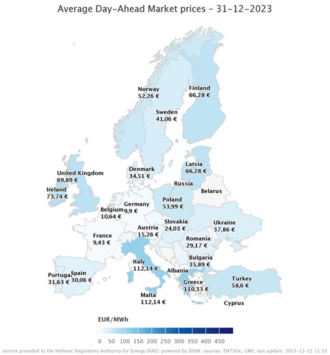 Αυτό, όταν το 2023 κλείνει με την Ελλάδα να έχει τιμή χονδρικής ρεύματος 110,33 ευρώ ανά μεγαβατώρα (31.12.2023) και τη γειτονική της Βουλγαρία να έχει 35,89 ευρώ ανά μεγαβατώρα, με την Ισπανία στα 30,06 ευρώ ανά μεγαβατώρα και με τη Γερμανία να έχει τη χαμηλότερη τιμή στα 9,90 ευρώ ανά μεγαβατώρα.