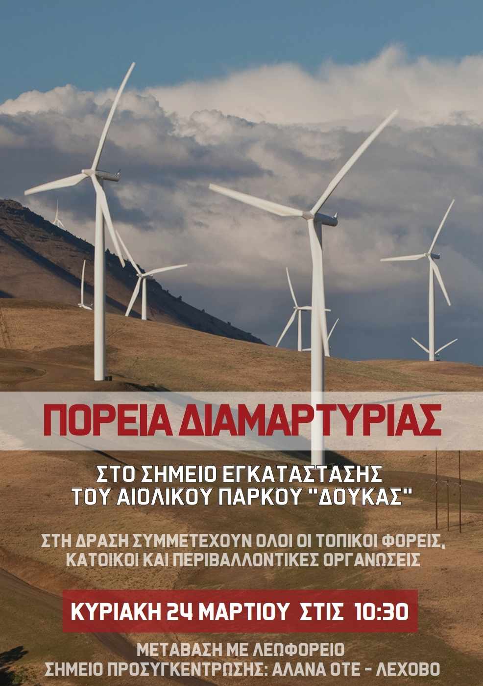Στο πλαίσιο της από κοινού διεκδίκησης για την οριστική ακύρωση της εγκατάστασης του ΑΣΠΗΕ στην περιοχή (ήδη εκκρεμούν 2 σχετικές αποφάσεις του ΣτΕ), φορείς της τοπικής κοινωνίας και περιβαλλοντικές οργανώσεις καλούν σε συμβολική συγκέντρωση διαμαρτυρίας στην τοποθεσία «Δούκας», την Κυριακή 24 Μαρτίου 2024 στις 11:00 πμ (σημείο συνάντησης 10:30 πμ στην αλάνα του ΟΤΕ, Λέχοβο).
