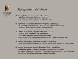Κεντρική εκδήλωση η συναυλία στο νησί του Αγίου Αχιλλείου στις Πρέσπες, το Σάββατο 24 Αυγούστου, όπου ο Μανώλης Μητσιάς και η Καρυοφυλλιά Καραμπέτη ζωντανεύουν τους στίχους μεγάλων Ελλήνων ποιητών, που έχουν μελοποιηθεί από σημαντικούς συνθέτες, στην παράσταση με τίτλο «Οι ποιητές μας τραγουδούν» και στο δεύτερο μέρος η Ευανθία Ρεμπούτσικα , η Έλλη Πασπαλά και η Dilek Koc. Ώρα: 8:15 μ.μ.