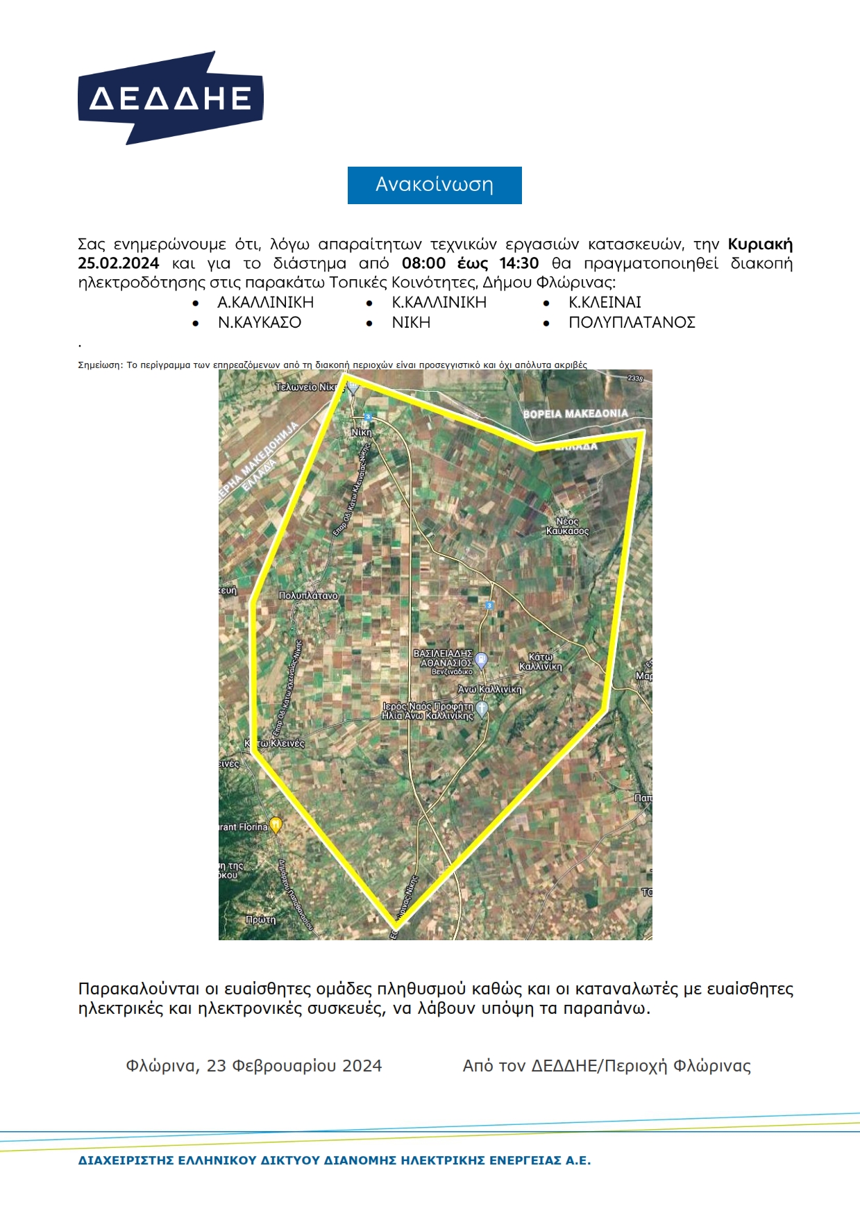 Προγραμματισμένη Διακοπή Ηλεκτροδότησης σε τοπικές κοινότητες του δήμου Φλώρινας την Κυριακή 25 Φεβρουαρίου 2024