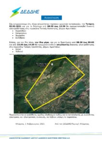 Προγραμματισμένη Διακοπή Ηλεκτροδότησης στη δημοτική ενότητα Αετού την Τετάρτη 3 Φεβρουαρίου 2021