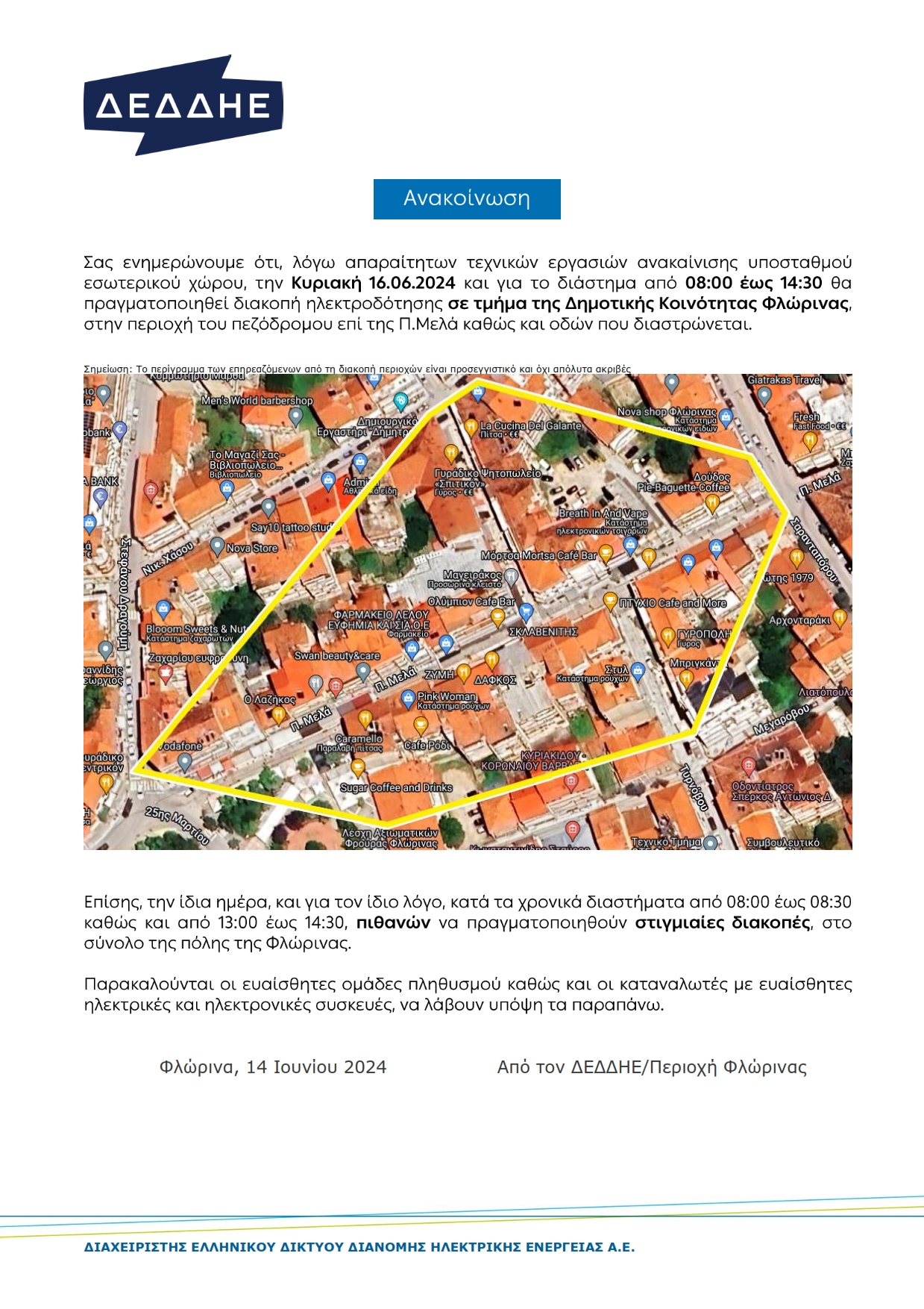 Σας ενημερώνουμε ότι, λόγω απαραίτητων τεχνικών εργασιών ανακαίνισης υποσταθμού εσωτερικού χώρου, την Κυριακή 16.06.2024 και για το διάστημα από 08:00 έως 14:30 θα πραγματοποιηθεί διακοπή ηλεκτροδότησης σε τμήμα της Δημοτικής Κοινότητας Φλώρινας,