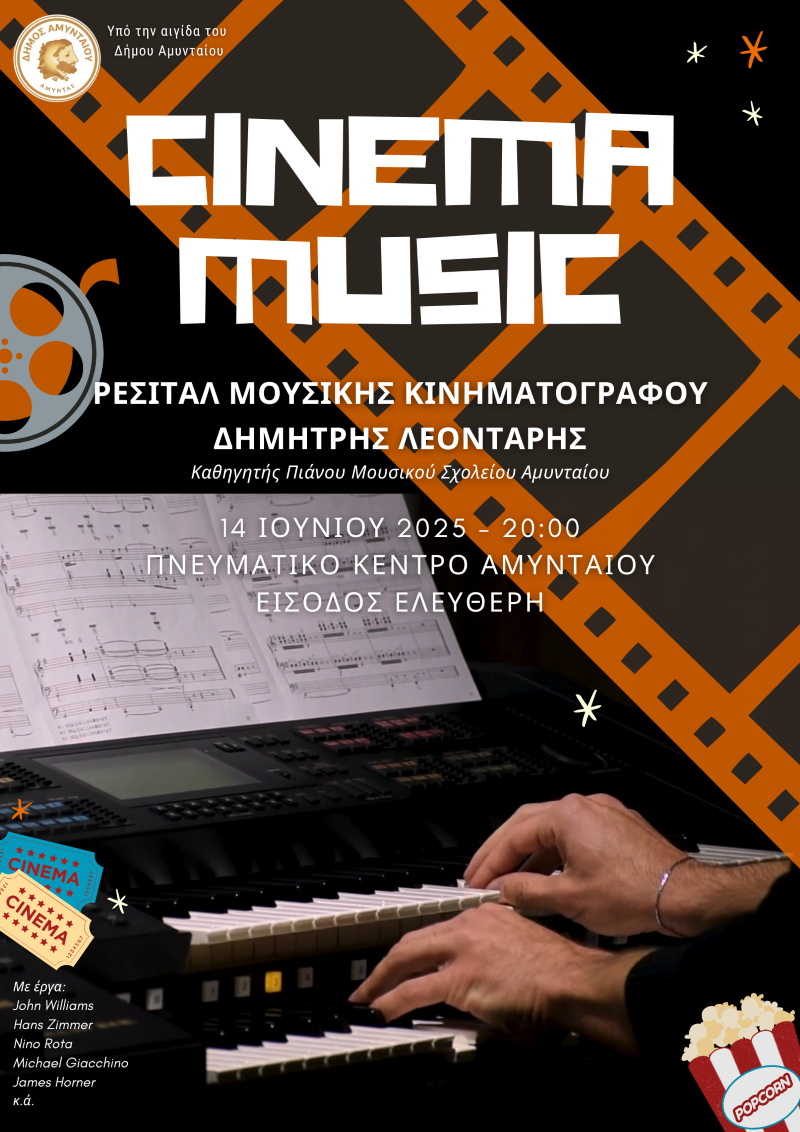 Το Σάββατο 14 Ιουνίου και ώρα 20:00 θα πραγματοποιηθεί στο Πνευματικό Κέντρο Αμυνταίου ρεσιτάλ με μουσικές από τον διεθνή κινηματογράφο των τελευταίων εξήντα περίπου ετών.