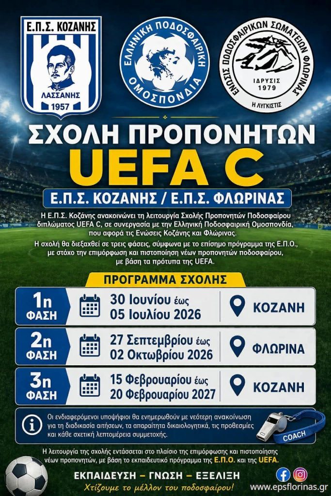 Η Ε.Π.Σ. Κοζάνης ανακοινώνει τη λειτουργία Σχολής Προπονητών Ποδοσφαίρου διπλώματος UEFA C, σε συνεργασία με την Ελληνική Ποδοσφαιρική Ομοσπονδία, που αφορά τις Ενώσεις Κοζάνης και Φλώρινας.