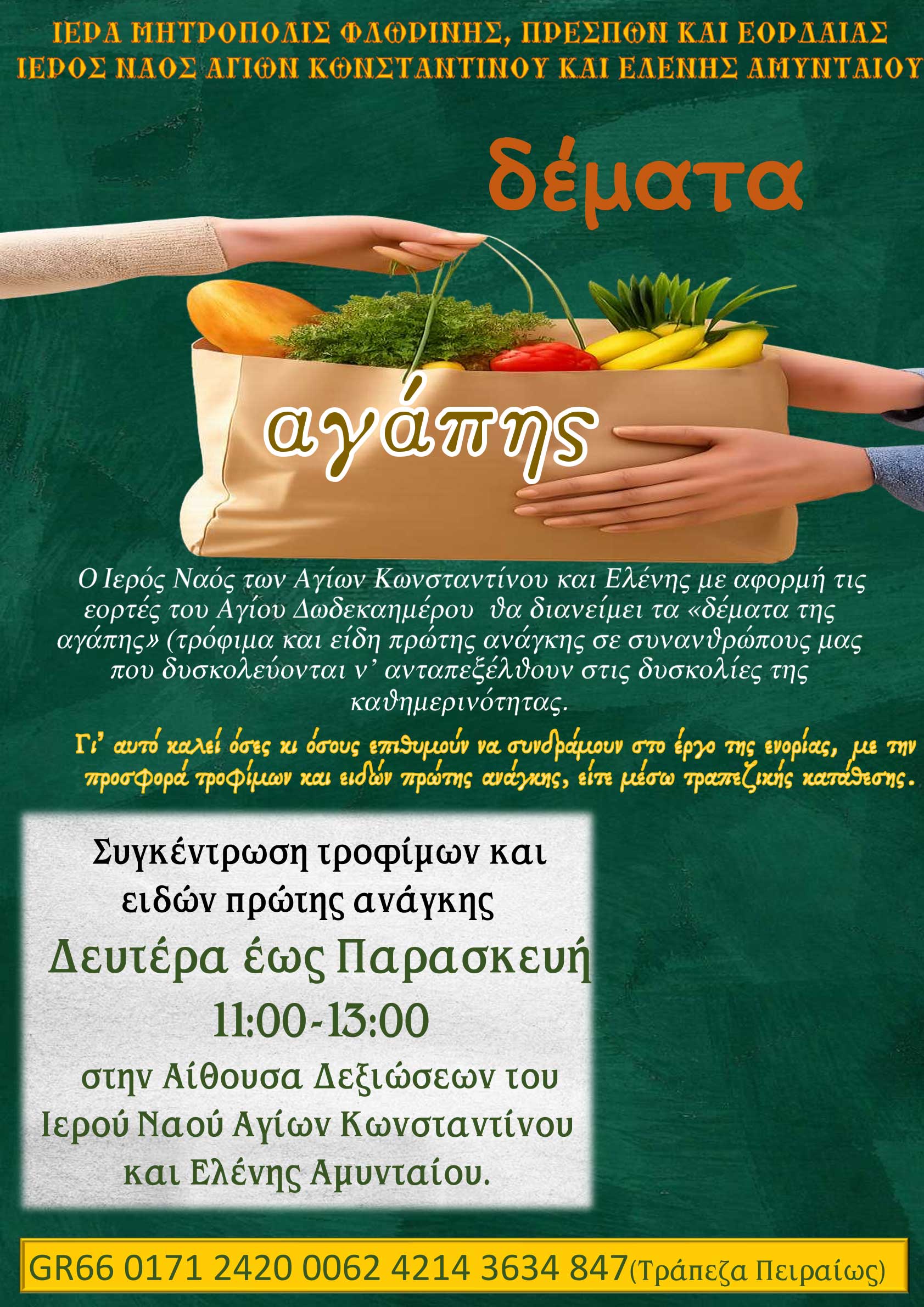 Ο Ιερός Ναός των Αγίων Κωνσταντίνου και Ελένης με αφορμή τις εορτές του Αγίου Δωδεκαημέρου θα διανείμει τα «δέματα της αγάπης» (τρόφιμα και είδη πρώτης ανάγκης σε συνανθρώπους μας που δυσκολεύονται ν’ ανταπεξέλθουν στις δυσκολίες της καθημερινότητας.