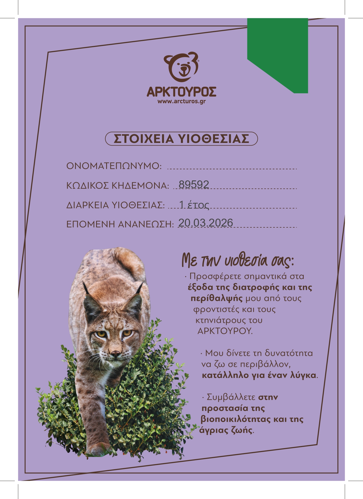 Οι μαθητές και οι μαθήτριες του 3ου Γυμνασίου Φλώρινας ανακοινώνουν με μεγάλη χαρά την  υιοθεσία της τρίχρονης Μίσι, ενός μικρού θηλυκού Λύγκα που φιλοξενείται μαζί με την οικογένειά της στο Κέντρο Προστασίας Λύκου και Λύγκα του ΑΡΚΤΟΥΡΟΥ. Με την υιοθεσία καλύπτεται μέρος της διατροφής της για έναν χρόνο. Η Μίσι ήρθε στην Ελλάδα από το πάρκο Naturlald της Ανδόρας, που λειτουργούσε ως ζωολογικός κήπος. Τώρα απολαμβάνει την ελευθερία της στις εγκαταστάσεις του ΑΡΚΤΟΥΡΟΥ στην Αγραπιδιά.