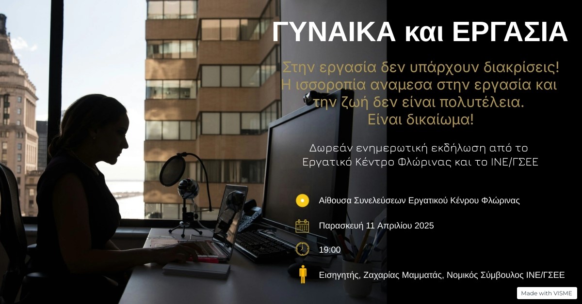 Το Εργατικό Κέντρο Φλώρινας, σε συνεργασία με το ΙΝΕ ΓΣΕΕ, διοργανώνει εκδήλωση με θέμα Γυναίκα και εργασία μια ισορροπία που αξίζεις