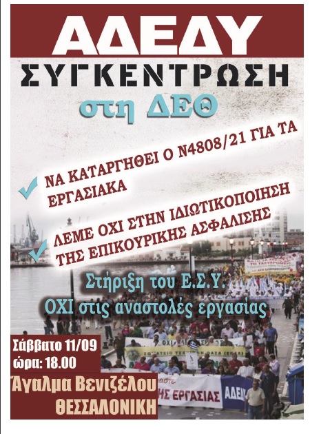 Το Γενικό Συμβούλιο και η Εκτελεστική Επιτροπή της Α.Δ.Ε.Δ.Υ. αποφάσισαν, με αφορμή τα εγκαίνια της ΔΕΘ από τον πρωθυπουργό, την πραγματοποίηση κινητοποιήσεων και συγκέντρωση διαμαρτυρίας το Σάββατο, 11 Σεπτεμβρίου 2021, ώρα 18:00, στη Θεσσαλονίκη για την ανάδειξη των αιτημάτων μας και την υπεράσπιση των κατακτήσεών μας.